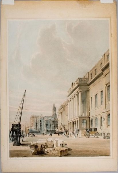 Curator: Thomas Shotter Boys created this print called "The Custom House, plate three from Original Views of London as It Is" in 1842, using lithograph, watercolor and drawing on paper. Editor: My immediate impression is one of bustling activity, rendered with a delicate touch. The colours are muted, almost faded, yet the scene is alive with implied movement. It presents a romantic vision, yet, underneath, speaks volumes about commerce, labour and colonial wealth. Curator: Indeed, there's a remarkable sense of spatial depth achieved through linear perspective and the atmospheric rendering of the sky. Note how the classical architecture of the Custom House dominates the right side of the composition, a clear symbol of power and order, punctuated by those striking vertical columns. Editor: But what is that order built upon? Observe the human scale in contrast. We see labourers hauling goods, indicative of England's imperial reach, drawing wealth from abroad, a system benefiting some, while exploiting the labour of many both within and without England. Curator: From a purely formal viewpoint, Boys displays an exceptional command of the watercolor medium, achieving fine details. His control of light and shadow gives the architecture solidity, contrasted by the softness of the sky. Semiotically speaking, one might examine the various symbols present, all rendered and balanced by careful aesthetic choices. Editor: Agreed, Boys displays clear technical mastery, but his romantic lens inevitably romanticizes, to some extent, an environment complicit in complex structures of class and exploitation. It’s a beautiful rendition but begs examination of that societal hierarchy present within England at the time, and within its relations to its colonial networks. Curator: A point well taken, by drawing on elements of the picturesque tradition he emphasizes beauty whilst glossing over some social issues, which leaves an interesting dichotomy between intent, form and the cultural ramifications of that work. Editor: I'm struck by the way Boys offers us both visual pleasure and prompts us towards more critical lines of inquiry, about empire and its material legacies in England, but I'm reminded that even beauty can be weaponized or instrumentalized toward exploitation.