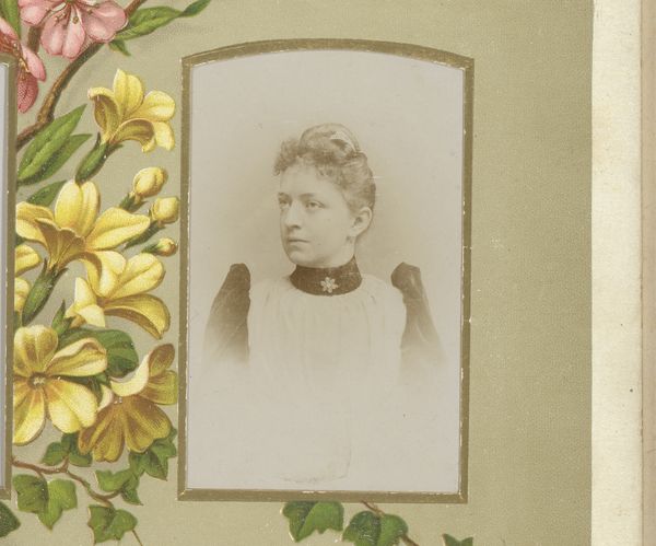 Curator: This photograph, titled "Portret van een jonge vrouw," which translates to "Portrait of a Young Woman," was created sometime between 1860 and 1900, credited to Baresel & Schubbert. It's a gelatin-silver print. Editor: The portrait has a delicate and melancholic mood. The soft focus and sepia tones impart a dreamlike quality, almost like peering into a faded memory. Curator: Pictorialism was gaining traction around this time, and you see that influence in the softness of the image. Photography was still establishing itself as an artistic medium, and techniques like soft focus helped photographers emulate painting. It lent the work legitimacy. Editor: Yes, the romantic style really softens what could be seen as an otherwise realist, even somewhat severe, image of a young woman on the cusp of adulthood. It makes me wonder about her interior world; does the image succeed in communicating it? Curator: It's interesting to consider the social role of photography at this time. Portraiture became more accessible, documenting not just the elite but a broader segment of society. Studios like Baresel & Schubbert democratized image-making, in a way. Editor: What stands out to me is the woman's gaze, averted yet still so present. Is it timidity, weariness, a hint of defiance, all bound in that enigmatic turn of her head? And it sits framed in something of gilded music sheets and floral embellishments. Curator: Certainly, portraiture in photography provides insight into the construction of identity in the late 19th century. From the choice of clothing to the pose, every detail communicates societal values and personal aspirations. This specific artwork highlights, especially for its time, this democratisation through art. Editor: A fascinating reminder of photography's role in both capturing and shaping our understanding of the past. Curator: Agreed. Its place as a social record, but also as art that both reflect the values and allows the subject a chance to reveal some piece of self, continues to impact us.