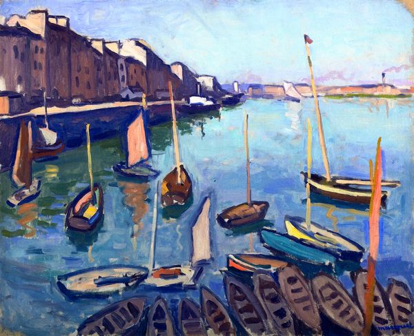 Curator: Oh, the light! It's fractured and dancing. The immediate impression I get from this work is one of vibrant energy. Editor: Well said! We're looking at "Grand Canal, Venice" created by Maurice Prendergast around 1899. What grabs me is how Prendergast handles the watercolor – it's almost like woven textile with those tiny distinct dabs. Curator: Exactly. Think of Venice at the turn of the century. It was more than just a location. It embodied a kind of performance—the elite's leisure, gendered spaces of tourism. The painting seems to touch on those layered experiences. Note how Prendergast situates gondolas as integral pieces of infrastructure—they're not simply decorations, but active contributors to Venice’s functioning society. Editor: Right, these gondolas, mass-produced objects made for transporting goods and tourists... What about the watercolor medium itself? Cheap and portable, watercolor became a staple for artists on the move. Prendergast's choice of watercolor directly speaks to the rapid expansion of artistic material culture as it met increasing demand. Curator: Fascinating observation, tying medium to market! I wonder, does the artist deliberately fracture our gaze to reflect on tourism's transient and often fragmented experience of place and people? How might his viewpoint inform contemporary discourses around the commodification of culture? Editor: Precisely. You can see in other Venetian paintings how watercolor democratizes the art world through a fusion of fine art sensibility and industrial production of art supplies. Curator: His handling really gives the impression that anyone can participate in making these pictures! By analyzing the art historical implications with the physical tools, it invites reflection on class and consumption. Editor: Thinking about the labor of Venetian artisans and boat-makers alongside the watercolor painters expands art criticism. Considering Prendergast's materials and methods reminds us of Venice’s evolution as an economic power that now relies heavily on the cultural consumption. Curator: It definitely provides food for thought, allowing us to engage on several fascinating cultural and artistic levels. Editor: Absolutely; a fine reminder to contemplate both process and broader cultural context.