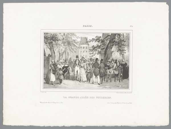 Curator: Victor Adam’s “Bloemenmarkt,” created in 1829, offers a glimpse into a bustling flower market in what I believe to be Paris. It's rendered through engraving, which adds to its meticulous detail. Editor: The immediate impression is one of subdued charm. The monochromatic palette creates a nostalgic filter, despite the activity depicted. The tonal range feels remarkably delicate. Curator: Delicacy indeed, though I would emphasize how this print captures early 19th-century commerce and class. Look closely; you see a microcosm of Parisian society. Women of varied social standing are engaged in what we might term the very early stages of a 'leisure economy', where shopping and display operate as performances in public space. Editor: I see how you're mapping social performance onto it. But technically, the lines produced by the engraving articulate forms clearly, the artist meticulously delineates the textures of clothing, flora, and architecture. The perspective guides the eye into the heart of the market with a skillful arrangement of light and shadow. Curator: Consider who isn't visible as well. Where are the vendors, and how are social exchanges taking place? There are power dynamics everywhere in who purchases what and where, the print really conveys this social order of Romantic-era Paris. Editor: Undoubtedly. The interplay of light across the composition and attention to texture produces a work that is rich, detailed, and harmonious, almost like a well-organized visual score. The architecture almost blends with the landscape; there is this beautiful fluidity to its composition. Curator: Reflecting on the historical implications here and how the print freezes a fleeting moment in Parisian life makes you see how historical artwork are not solely about who or what is there but what's not present and hidden underneath what's given in plain sight. Editor: It's true; through this process of aesthetic exploration and understanding context, one hopes we come closer to appreciate Adam’s technical craft as well as his snapshot of a time very far removed from our own.