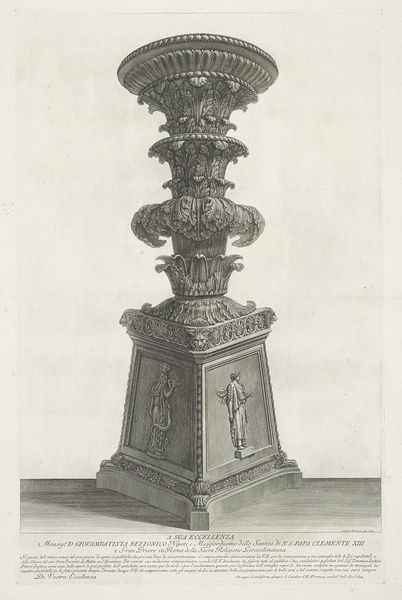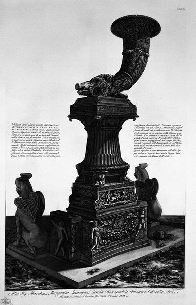Editor: This print, "Perspective view of the same funerary monument depicted in the preceding etching," made by Giovanni Battista Piranesi between 1769 and 1778, offers such an elaborate architectural construction. The detailed relief work, rendered in engraving, reminds me of a stage set, almost theatrical. How do you interpret its formal qualities? Curator: The print masterfully employs line and tone to construct a hierarchical visual experience. The eye is drawn upwards, tracing the monument's ascending structure from the figural reliefs to the crowning bestial cornucopia. The composition utilizes rigorous geometry but the surface ornamentation adds significant textural variation. Editor: So, the interplay between the geometric structure and surface decoration is key? Curator: Precisely. Consider how Piranesi uses light and shadow to articulate the individual components. Each plane receives careful modulation, contributing to the overall sense of depth and solidity. Do you notice any specific areas where this is particularly effective? Editor: Yes, the base, particularly how the figures emerge from the stone and the shading around the decorative elements creates three-dimensionality, separating them from the flat background. The cornucopia also shows exquisite shading that highlights the three-dimensional volume. It is compelling! Curator: Indeed. This focus on the intrinsic elements reveals the monument's internal logic, it is self-contained. What at first seemed an exuberant design shows careful application of form and line. Editor: That gives me a new perspective; by focusing on the form we can appreciate how Piranesi created this elaborate work from combined structural components. Thanks! Curator: A pleasure. Thinking about the artistic intention of geometric organization reminds us to observe the aesthetic value.