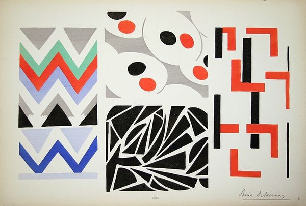 Curator: So, this abstract print is titled "Rhythm Colour" by Sonia Delaunay. It feels quite joyous, doesn’t it? The shapes are almost dancing! Editor: My first thought was 'controlled chaos.' The shapes are simple - squares, circles, triangles - but their placement… it feels deliberately unsettling, those juxtaposed bright colours. Curator: Absolutely, Delaunay’s exploration of Orphism, particularly simultaneous contrast, is in full swing here. Notice how the different colours appear to vibrate and shift, creating this energetic visual effect. Almost like music made visible, no? Editor: The symbolism's interesting too. The circle, bisected, in primary colours: it echoes ideas of totality and division, doesn't it? What looks solid on the first approach dissolves into contrasting planes. Curator: Indeed! Delaunay moved seamlessly between painting, textiles, and design. She understood that rhythm wasn’t just a visual thing; it’s woven into everything, this constant conversation, like jazz. Editor: And this feels quite modern, that fragmentation. Are we seeing a reflection of the machine age in these clashing geometric shapes? It could almost be diagrams of a strange device or deconstructed machinery. Curator: I think it’s also about the pure pleasure of colour relationships, something that existed way before technology. How yellow against green feels versus red and blue. Editor: So true, though that hatched gray at top-left; it stands out so strongly, it lends the image an unfinished rawness in the otherwise hard planes of vibrant colour. It gives an illusion, that the piece can develop. Curator: Well, regardless, "Rhythm Colour," even decades later, bursts with this incredible sense of movement, change and light. A kind of defiant optimism. Editor: Exactly. And that interplay of light and shade, order and disarray…It stays with you, prompting this sense of continuous reinterpretation. I can certainly hear some jazz when seeing it again now.