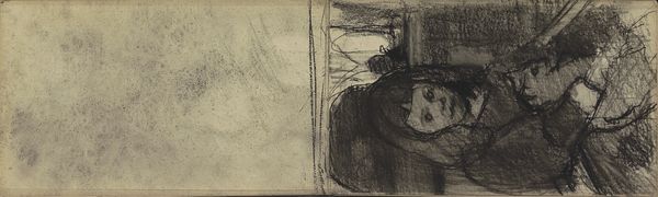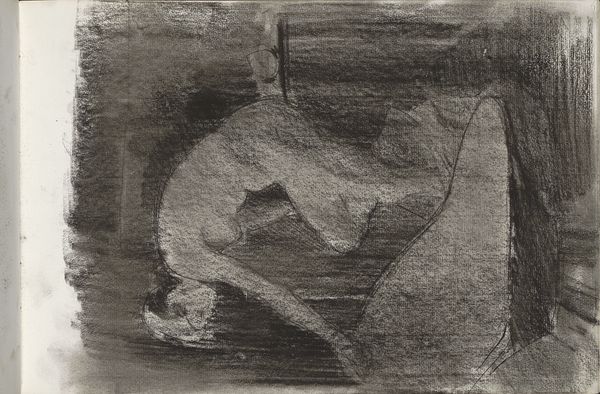 Willem Witsen made this charcoal drawing of a bending female nude in an interior. The composition is striking: the figure’s arched back and the dark, almost abstract background create a sense of enclosure. Witsen uses charcoal to emphasize the contrast between light and shadow. This technique not only defines the form of the figure but also contributes to the emotional intensity of the scene. The texture of the charcoal adds depth and a tactile quality to the drawing, inviting the viewer to engage with the artwork on a sensory level. The bent posture might destabilize traditional representations of the female nude. The power of this drawing lies in Witsen's ability to use simple materials to explore complex themes of form, space, and the human condition. The drawing remains a dynamic site for ongoing interpretation.