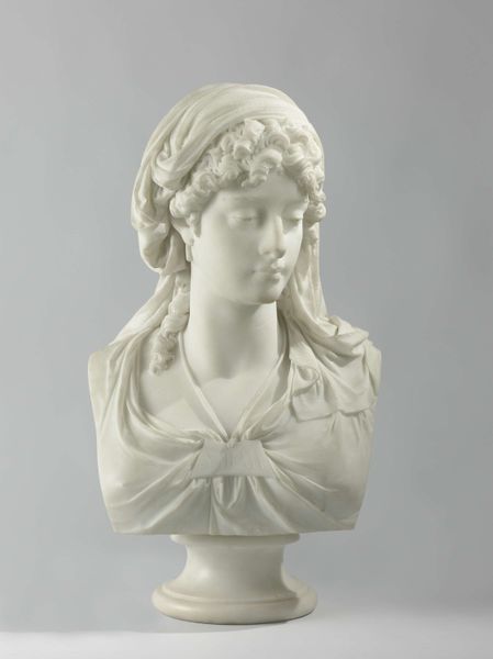 Curator: Looking at Jean-Antoine Houdon’s marble bust of Anne-Marie-Louise Thomas de Domangeville de Sérilly, Comtesse de Pange, sculpted in 1780, you can almost feel the chill of the stone. Editor: Indeed. The coolness of the marble perfectly captures a certain reserve in her expression, a sort of aristocratic detachment. The texture alone telegraphs an aura of timeless dignity. Curator: Neoclassical sculpture often invokes ideas of virtue and enduring legacy. The clean lines and balanced composition point to a desire to immortalize the sitter as a figure of grace. Her gaze is averted, but not shy; more like contemplating something just beyond our view, her family's standing, perhaps. Editor: Notice how Houdon employs a calculated asymmetry, however subtle. The drapery is casually arranged but clearly not accidental. The flowing lines contribute to an active surface dynamic that contradicts the stillness implied by the marble medium itself. Is this sculpture about permanence, or is Houdon pointing toward the fleeting nature of existence despite marble’s seeming immutability? Curator: Think about what it meant to be sculpted in marble at that time. It was about conveying social status and ideals, and Neoclassicism was the perfect vehicle to channel it all: civic virtue, idealized beauty, aristocratic elegance. This idealized depiction served to bolster the subject's place within society and affirm lasting dynastic impressions. Editor: Yes, but the visual rhetoric is masterful as well. Consider how light interacts with the surfaces, and it shapes perception, highlighting specific aspects of character, almost animating a marble form through a series of visual cues. What would semiotics say? Is it ever possible to separate material analysis from sociocultural messaging? Curator: Very difficult, I’d argue. A portrait bust such as this wasn’t merely decorative; it served as a potent symbol, imbuing the subject with significance for generations. Looking at it today reminds us of France's history but also raises questions about portraiture, representation, and the perpetuation of certain identities over time. Editor: Seeing this sculpture again reminds me to embrace contradiction: between its aesthetic presentation and intrinsic philosophical inquiries. What may seem simple becomes more intricate the deeper you examine it. Curator: Precisely; the visual language gives way to cultural dialogues, as relevant now as they were then.