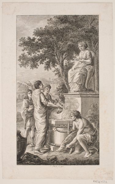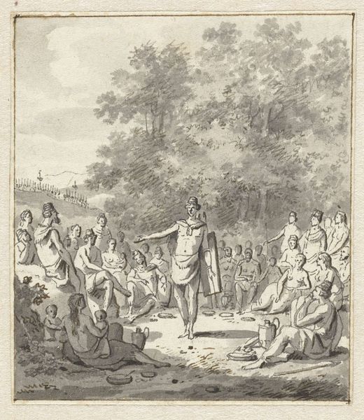 Editor: This is Hieronymus Lapis’s “Eliezer and Rebecca at the Well,” a pencil drawing from sometime between 1733 and 1798. It's such a busy scene, lots of figures gathered around the well. What story do you think it’s trying to tell, and how does it relate to its time? Curator: This piece brings to mind questions around labor and gender in the 18th century. Notice how the women are centered around the well, performing this essential, yet often invisible labor, fetching water. How does this depiction reflect the social roles and expectations placed upon women of that era? And how might that relate to contemporary power structures, and access to resources for women today? Editor: I see what you mean! The women *are* very active in the composition, doing a lot of the work. It makes you wonder about their positions in society. Are we meant to see this work as simply a depiction of everyday life, or could it be a commentary on social norms? Curator: I think it is both a reflection and, potentially, a subtle commentary. The artist has chosen a biblical scene – the story of finding a wife for Isaac - and reinterpreted it. What if we consider how the representation of Rebecca here, offering water, mirrors both a gesture of hospitality and also of servitude? How do these narratives reinforce or challenge patriarchal structures that we continue to grapple with? Editor: That's a really interesting point about Rebecca and the way she is offering hospitality while also, perhaps, embodying servitude. It makes me see the whole scene in a different light, thinking about gender and social dynamics in the past and even now. Curator: Exactly! It is key to interrogate these representations, uncovering their subtle power dynamics and continuing impact. Engaging with historical artworks means continually questioning what stories are being told, by whom, and for what purpose. Editor: This has given me a whole new perspective on how to look at historical art. It is not enough to know the story; we need to consider the power dynamics behind it, and what we can learn from the piece today. Curator: Agreed! Let’s carry that critical lens with us as we explore the next artwork!