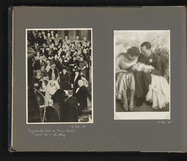 Curator: Looking at this photographic print titled "Het Prinselijk Echtpaar December 1938" or "The Princely Couple December 1938," a genre painting rendered through photography, I'm struck by the intimate portrayal of the soon-to-be queen and her consort. It’s from 1938. Editor: It has that certain quiet formality, but the angle creates an atmosphere like we just glimpsed them from another table. It’s fascinating how a photographic medium in that time captured a genre moment. A posed picture trying to suggest otherwise perhaps. There is an atmosphere of expectancy of what may come. Curator: Absolutely. This particular photograph, taken in December 1938, predates her ascension to the throne and, in many ways, represents a visual anticipation of that transfer of power. Think about the subtle symbolic cues in their attire – his formal dress, the careful tailoring, her own…interesting outfit, to put it mildly. Editor: Ah, her fluffy shoulder ruffles! I wonder about those ruffles. Is that wealth on display, that you can essentially festoon yourself with a cloud? And his suit looks impeccably starched, an impenetrable shield of expectation and dynastic duty. So much constraint visually implied here! I mean, just how much could they actually let loose when every angle was being carefully recorded and cataloged? Curator: The framing here draws us directly into their carefully constructed reality as heirs apparent. I see so many psychological archetypes. Consider the significance of a ‘princely couple’—a representation of future leadership, national identity, and the continuity of the monarchy, framed, captured, and circulated, this photograph helped reinforce that image. A social contract sealed in silver halide! Editor: Precisely. There's something potent about these images—how carefully cultivated they were to build the mythos around this moment. They look trapped in aspic, you know? Like figures in a museum diorama of royal expectancy. You almost pity them while understanding the image wants you to admire them, even desire to emulate what they seem to represent. The viewer stands between admiration and maybe… a little horror. I think that says so much. Curator: It encapsulates the very essence of power and its visual construction in an interesting way! It also serves as a fascinating testament to the enduring fascination with the British Royal Family and its symbolic representation. Editor: A slice of curated reality served up as aspirational content, or at least the Edwardian iteration of it, hmm? So very intriguing!