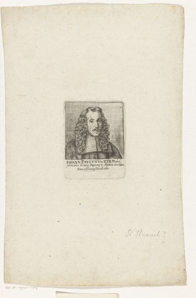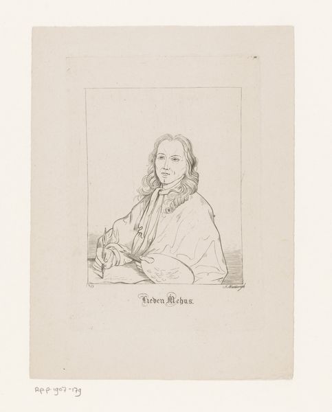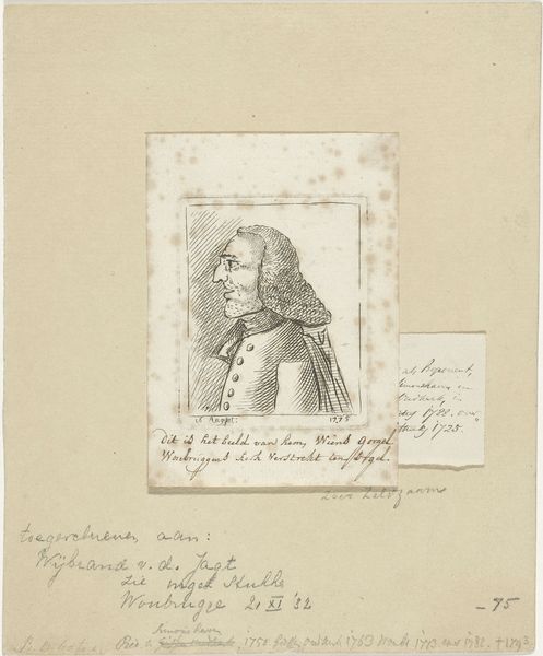 Curator: My first impression? Intimate, almost delicate. There's a certain vulnerability to this rendering in pencil. Editor: Indeed. What we're looking at is titled "Portret van John Dunton, boekverkoper te Londen," or "Portrait of John Dunton, Bookseller in London." It's an anonymous work, dating roughly between 1825 and 1900. The medium is pencil on paper. Curator: The subject’s attire and that voluminous wig place him earlier, doesn't it? The sketch captures that Baroque sensibility, yet produced so much later! I'm fascinated by the process—the subtle gradations achieved with just pencil. What was the artist hoping to convey, choosing such a readily available, modest material? Editor: Good question. Consider the historical context. By the late 19th century, printed images were becoming more commonplace. This drawing, perhaps copied from an earlier engraving, participates in the circulation of images of notable figures, like Dunton. These images contributed to the public construction of identity, but, let’s be real, they helped establish and maintain a sort of cultural and political power too. Who decides who gets remembered and how? Curator: Right, and who had access to pencils, paper, and the time to dedicate to replicating images? This was far from universal. It tells us about class, about leisure, and access to education. There’s an intimacy to pencil; it's so immediate, it registers every shift in pressure, the artist’s very hand…but also their resources. Editor: And the sitter! John Dunton was indeed a prominent London bookseller in the 17th century. So, in this drawing created centuries later, we have a visual artifact memorializing not only the man but also the evolving book trade itself. Think about it—the original context in which Dunton produced and sold books is long gone. Curator: Which begs the question, how would an ordinary viewer during this portrait’s creation react, coming face to face with an idealized image of someone connected to print culture? The creation and viewing were separate, but together it presents a complete artifact. Editor: Absolutely, especially when you consider this probably wasn’t viewed as “high art,” but a more functional reproduction made available in broader cultural formats of its era. Curator: So, we end up examining not only a portrait but the socio-economic systems enabling both its creation and Dunton’s fame, a quiet commentary rendered with such humble materials. Editor: Precisely. It is, at its heart, an intriguing window into shifting cultural values and image production within 19th century British society.
