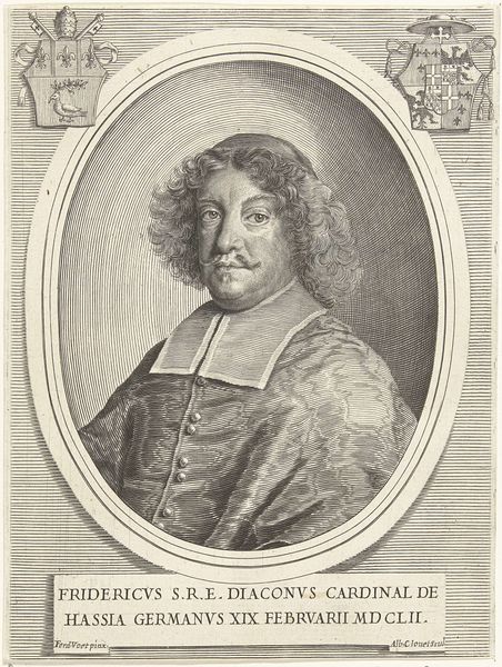 Curator: Here we have Robert Nanteuil’s portrait of Louis-François de la Baume de Suze. The engraving captures its subject within an oval frame, complete with inscription and heraldic shield. Editor: It's striking how Nanteuil renders the textures—the sheen of the cloak, the soft curls of his hair. But that gaze… it's aloof, almost weary. What can we infer from that expression? Curator: Nanteuil was the portraitist of choice for the French court. This image communicates status, yes, but also the weight of responsibility carried by figures like de la Baume de Suze, an important religious leader. Editor: Absolutely, and I wonder about the role of the heraldic shield. Does it solely reinforce lineage and power, or does it also invite critical analysis of class structures within the Church? Curator: It's both, I believe. Visual cues intended for admiration and symbols ripe for questioning. Editor: Exactly, understanding that duality deepens our appreciation. Curator: Indeed, it provides a richer understanding of the complex world Nanteuil inhabited, and of the society this Bishop served.