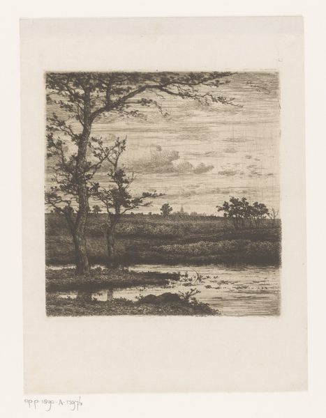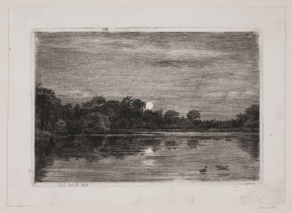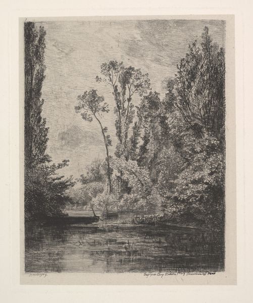 This tranquil, untitled landscape was etched by Hamilton Hamilton, an artist who lived through a period of immense transformation in American art and society. Born before the Civil War and passing away on the brink of the Great Depression, Hamilton witnessed rapid industrialization and urbanization which fueled a nostalgic longing for simpler, pastoral scenes. Looking closely, we can see the heron taking flight, the quiet stillness of the water, and the lushness of the trees which evoke a sense of longing for nature and a bygone era. Through subtle details, Hamilton hints at broader societal concerns about the impact of modernity on the American landscape and its people. While seemingly apolitical, this work reflects the cultural anxieties and shifting identities of a nation grappling with progress and its consequences. It's a moment of reflection—a reminder of what we stand to gain and lose as society evolves.