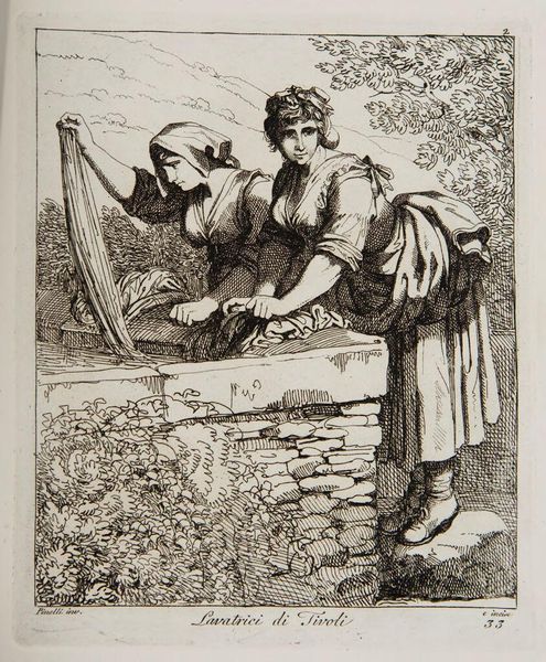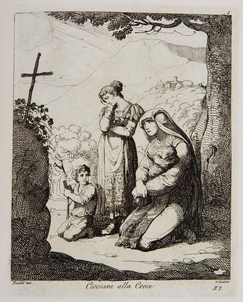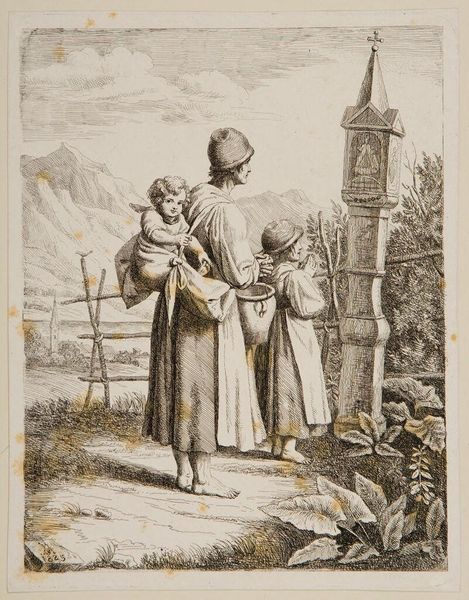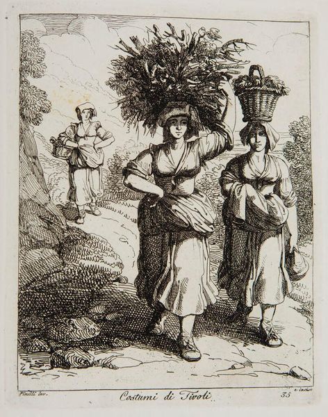 Editor: So, this is "Costumes from Tivoli" by Bartolomeo Pinelli, and it looks like an etching. It's got this everyday feel, women carrying things, kids tagging along... It feels very Italian countryside. What do you make of it? Curator: It's Pinelli doing what he does best: capturing the soul of Rome and its surroundings. But look closer. He's not just documenting; he's romanticizing. The women are almost statuesque, carrying burdens with grace. The etching emphasizes line, almost like he's sketching a memory rather than a scene. Do you see the narrative unfolding beyond the immediate foreground? Editor: I see what you mean! They seem to have this heroic air about them! Curator: Absolutely. He elevates the mundane, reminding us of the inherent dignity in daily life. These aren't just costumes; they're symbols of resilience and tradition. It's a beautiful dance between observation and idealization.