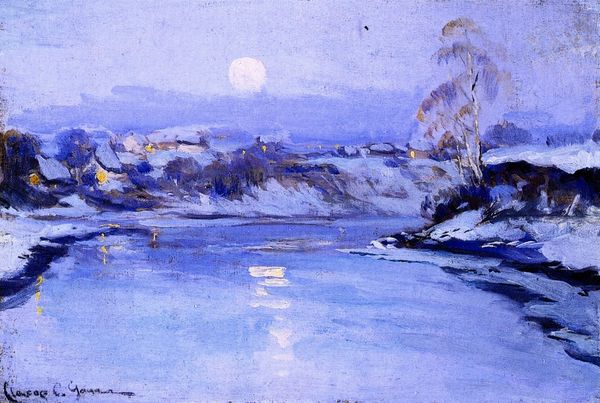 Childe Hassam created this evocative painting, simply titled 'Moonlight,' using oils to capture a serene coastal scene. The moon, a universal symbol of mystery, time, and cycles, dominates the composition, its glow reflected in the tranquil waters below. Across cultures, the moon has been deeply intertwined with human emotions and spirituality. One finds the lunar deity represented in ancient mythologies, such as the Greek goddess Selene, mirroring the moon's influence on the tides and the cyclical nature of life. Here, the moon isn't merely an astronomical body; it is an emotional catalyst. It evokes a sense of solitude and contemplation that has been a part of humanity's subconscious for millennia. The painting's cool hues of blue and the soft brushstrokes further enhance this sense of quiet introspection, drawing viewers into a meditative state. The moon continues to resurface as a potent symbol, evolving in its representation but eternally linked to our deepest emotions and collective memories.