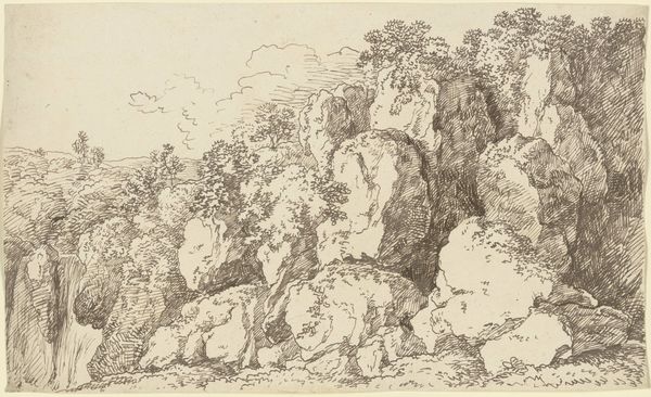 Curator: Let’s have a look at this captivating drawing: "Felsschlucht mit zusammenlaufenden Wasserfällen" by Franz Kobell, held here at the Städel Museum. It's executed in pen and ink, showcasing Kobell’s adept skill in landscape drawing. Editor: Whoa, it’s incredibly busy! In a good way. My eye darts all over, trying to piece together this wild, watery landscape. It feels almost…overwhelmingly Romantic, you know? The light and dark contrasting wildly and leading you through every layer, almost cinematically. Curator: Indeed! Kobell really exploits the pen's potential, doesn’t he? See how he builds up texture with those close, rhythmic lines. It creates a real sense of depth, but also reveals the hand, the labor that goes into creating the illusion of this immense scene. And that reveals so much about Romantic-era art production. Editor: The line work is beautiful! Almost frenetic in its energy. It feels less about strict representation and more about conveying an experience—the cool dampness of the rocks, the roar of the falls… Did everyone feel so overwhelmed by nature back then? It’s like they’re channeling nature's sublime chaos onto the page, isn't it? Curator: It's certainly capturing the burgeoning romantic ideals! Think of the availability of pen and ink versus painting. These kinds of drawings allowed artists to connect intimately with nature, to rapidly iterate and create these emotive scenes en plein air, thus fostering the movement's interest in art being raw and individualistic. Editor: You've got a point there. And there are two small figures at the bottom, observing everything. That’s pretty humbling – just us and nature. Makes you feel small. The composition, with its layered details, pulls you right into that realization! Curator: It makes us really think about accessibility to art at that time. What materials were available and for what cost to capture a certain feeling that artists like Kobell experienced. The pen and paper really were the peoples artistic rendering, you could say. Editor: Exactly. A great reminder that access to artistic tools profoundly shapes not just who makes art, but how we interpret it and what we're hoping to communicate through those means!