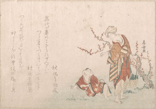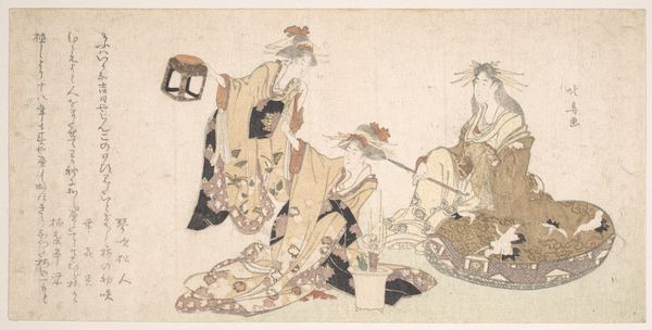 Ryūryūkyo Shinsai made this print, Two Women and a Girl Feeding a Crane at the Verandah, using woodblock printing, a process typical of the Ukiyo-e school. With its emphasis on skilled carving, registration of color, and the right paper, the print reflects the close collaboration between artist, block carver, and printer. In the making of Ukiyo-e prints, each color was applied using a separate woodblock, requiring careful alignment to achieve a cohesive image. The flat planes of color, flowing lines, and depiction of everyday life give us insight into the world of 19th-century Japan, as does the social status of the women depicted and their cultural setting. The print exemplifies a highly refined commercialized form of art, where specialized craft and artistic skills merged to cater to a broad urban audience. Appreciating the print means recognizing that the artwork is a product of collective labor and economic exchange, beyond just individual artistic expression.