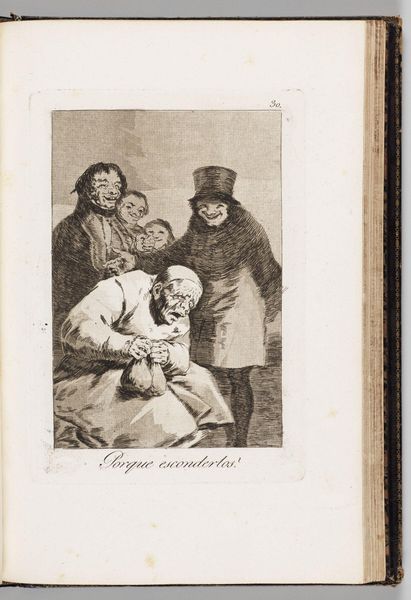 Curator: This is Francisco Goya's "Why Hide the Purses?" from his series *Los Caprichos*. Look closely. What’s your first impression? Editor: Sheesh, a creepy circus! That old man clutching his coin purse looks terrified. Curator: Indeed. This etching uses satire to critique the social structures of 18th-century Spain, specifically the abuse of power by the clergy and aristocracy. Editor: See, I knew there was something sinister! The leering faces behind him…like vultures, ready to pick him clean. Curator: Consider also how the title itself, "Why Hide the Purses?", challenges the accepted norms of wealth and status in a society riddled with inequality. Editor: Makes you wonder, doesn't it? Who are the real thieves here? Certainly something to think about! Curator: Goya invites us to question the ethics of those in power and the vulnerability of those without it. A very poignant observation. Editor: Yup, even now, it gives me the shivers—a timeless message, unfortunately.