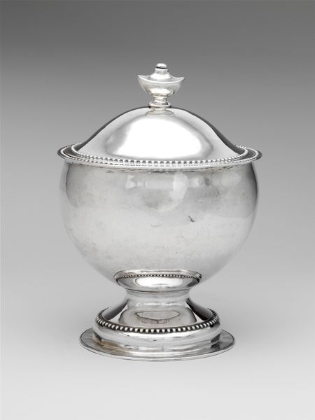 Curator: This exquisitely crafted sugar bowl dates back to the late 18th century. It's currently part of the collection at the Metropolitan Museum of Art. Editor: It seems smaller than I expected somehow. I feel an instant calm looking at it – a sort of elegant minimalism despite all those curves and the decorative details. Curator: Indeed. Its deceptive simplicity is key, particularly within the Rococo movement from which it emerged. These pieces, whether silver or ceramic, speak of luxury and refined living. It embodies both ceramic and silver craftsmanship, and its designer is considered to be Thomas Shields. Editor: Ah, that swirling script on the side! It’s like a little visual puzzle—personal emblems hinting at family histories and inherited wealth. What does sugar represent back then? Curator: Prestige, undeniably. In the 18th century, sugar was becoming increasingly available but was still associated with wealth due to colonial trade. Thus, owning such an ornate container made a rather loud, clear statement! Editor: I notice that tiny twisty knob, it almost feels like a key to something, unlocking not a box, but layers of meaning, trade, colonialism... A sweet but complicated thing! And so reflective... Curator: Precisely! That reflection, that subtle curve, this object speaks silently. It reminds us how seemingly innocuous everyday objects carry such a density of cultural history. Editor: Yes, thinking of this piece not just as beautiful, but as a historical carrier—reminds us about a bygone era where this little luxury item was quite literally a conversation starter. Curator: Exactly. It is so much more than meets the eye and reveals to those who examine a sweet, or perhaps bittersweet history of early America.