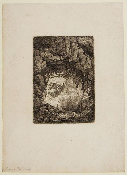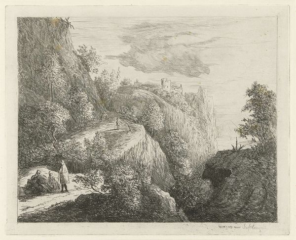 This print, "Hond en kat" or "Dog and Cat," was made by Gerard van Nijmegen sometime in the late 18th century. During this period in the Dutch Republic, there was a growing interest in natural history and the depiction of animals. The print illustrates a tense encounter between a dog and a cat within a dense, natural setting. Look at the way the scene captures a dynamic of power. The dog is on the defensive, seemingly cornered, while the cat arches its back. The bristling fur of each animal suggests a moment of high anxiety and potential conflict. Is this encounter just an ordinary scene, or might it reflect broader societal tensions? How might we read this depiction of domestic animals in relation to hierarchy? The cat’s posture—raised up, alert—suggests a challenge to the assumed dominance of the dog. The cat is not submissive, but assertive.