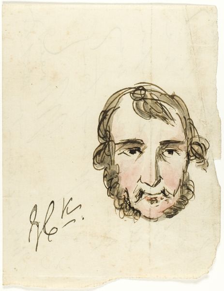 Curator: Before us, we have George Cruikshank’s "Self-Portrait," rendered using pen and ink on paper. The artwork’s date is unknown. Editor: My initial impression is one of thoughtful introspection. There's a nervous energy in the lines, a sort of controlled chaos around the head and shoulders that suggests a restless mind at work. Curator: Absolutely. The technique is striking, isn’t it? The density of the linework varies greatly. Note how Cruikshank uses short, rapid strokes to delineate the contours of his face and hair, creating areas of shadow and depth. Look at the contrast between the finished details on his face and the implied lines of the body. Editor: I see a connection between his chosen medium and the cultural context of early 19th-century caricature, a field Cruikshank heavily contributed to. His loose style evokes a satirical eye – hinting that beneath the facade of self-presentation there might lie some deeply felt social critique. Can we see the man as the mirror, or simply one reflecting back an unfair society? Curator: Yes, the Romantic-era is alive and well in this depiction! Note how the artist masterfully balances areas of detail and suggestion. The eye is immediately drawn to the carefully rendered facial features—eyes, nose, and mouth—which convey a sense of the subject’s personality, while the looser lines surrounding the face create a dynamic sense of movement. The very sketchiness can tell us what he might have considered worth showing vs. not showing. Editor: Furthermore, his gaze, averted to the side, perhaps implies a subtle resistance or a quiet observation of societal hypocrisies. It reflects a Romantic sensibility—that of individual feeling at odds with, or separate from, prevailing social norms. The unpretentious rendering feels like an act of subversion in and of itself! Curator: That's well put. This drawing encourages us to appreciate the expressive potential inherent in even the simplest of artistic means. It reminds me how an artist’s close study of line and form can be remarkably effective for not just representing likeness but also emotion. Editor: In essence, this "Self-Portrait" resonates as a potent reminder of the socio-political relevance latent within modes of self-representation. The artistic intention seems more aligned to question established aesthetic ideals than to embody pure beauty alone.