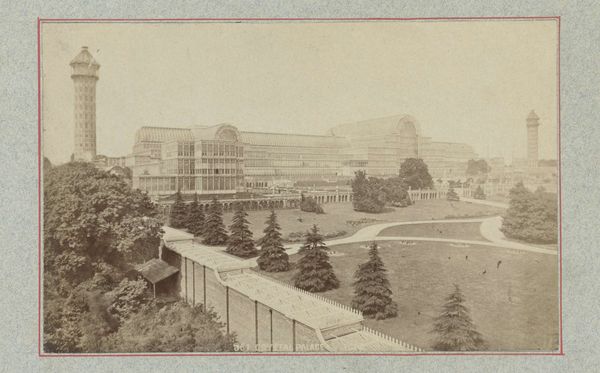 Curator: Today we're looking at "Het Crystal Palace bij Sydenham," a work by Francis Godolphin Osbourne Stuart, created sometime between 1880 and 1910. The work, created via photography, is an albumen print, an early method of photography that renders this scene with a stunning tonal range. Editor: My first impression is one of wistful grandeur. The sepia tones evoke a bygone era, and the architecture itself is monumental, yet there's a subtle softness to the image, especially in the rendering of the sky. The structure of the composition also gives off feelings of precision and order. Curator: It's quite remarkable to consider what the Crystal Palace represented during its time: a symbol of British industrial power and colonial reach, especially given the building’s original construction to house the Great Exhibition of 1851, and, one must not forget, using wealth and resources accrued via imperial violence. Stuart’s photographic approach invites us to think about how identity and progress were intimately linked to class and empire during the late 19th century. Editor: Indeed. Shifting to the aesthetic qualities, let’s consider the meticulous composition. Notice how the receding lines of the garden paths and the strong horizontal emphasis of the palace itself create a sense of depth and perspective. There is also the strong geometrical relation of forms that guides our viewing process. This is cleverly juxtaposed with the softening effect of Pictorialism which really emphasizes the contrasts. Curator: Precisely. And while it may be viewed today as simple “outdoor photography” this representation has heavy ties with the construction of what can be viewed and what is worth viewing during the expansion of cities that occurred due to industrialism. As such, it speaks to issues of representation of history, industrialism, power, and place that all relate to each other. Editor: The success of albumen printing is also paramount; observe the balance and gradations present, rendering great textural clarity across a singular tonal scheme. Curator: Ultimately, it is works like these that challenge us to engage with both the artistic representation and the intricate cultural, historical, and sociological narratives embedded within its visual framework. Editor: I concur, reflecting on it, it also showcases photography's unique capacity to articulate the passage of time and light and our understanding of material objects.