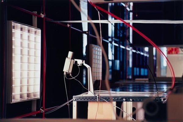 Lewis Baltz took this photograph of a Cray supercomputer at C.E.R.N. in Geneva, Switzerland. The way the colours are applied in blocks is so striking, the vertical stripes of yellow and blue, it's like a Mondrian painting, but instead of paint, it's the sleek, industrial surfaces of the computer. There's a real tension in the photograph between the slick surfaces and the cold, manufactured colour. The tile of the floor is a similar colour to the background but is broken up by the black lines. These colours don't quite sit together, making it feel slightly off-kilter. It feels like Baltz is deliberately constructing a way of seeing that challenges our understanding of these technologies. The way the image is lit really emphasises the textures and surfaces, making them feel almost palpable. Look at the blue base of the columns, a soft, almost inviting material to contrast with the stark lines of the screens in the background. Looking at this piece, I'm reminded of the work of Andreas Gursky, who also explores the intersection of technology, architecture, and the human experience.