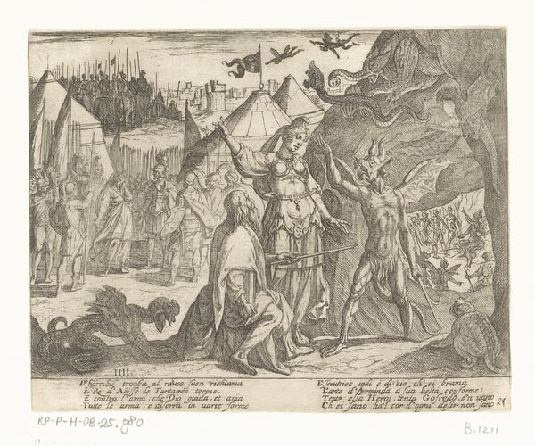 Curator: This engraving from 1676, titled "Tot slaaf gemaakte Bengalezen aan de Nederlanders verkocht"—"enslaved Bengalis sold to the Dutch,"—offers a stark vision of the colonial era. The name of the artist is unknown, although the lower right states “Uit W. Schouten 1676” Editor: My immediate response is discomfort. The stark lines and the composition depicting such disparity create a really unsettling feeling. You see the crisp details etched into the metal, and the image itself is a testament to the mechanical reproduction of violence and subjugation. Curator: Indeed. As a print, likely disseminated widely, this image played a role in shaping perceptions of colonialism and the slave trade. Consider the material properties—the paper, the ink, the very act of replication—all contributing to the circulation of this narrative. This would have involved the labour of numerous printers. How many copies were circulated? What was the production cost for the artist? Editor: It's also important to unpack whose narrative it is. The European gaze dominates. Where are the voices and perspectives of the Bengalis being sold? The composition literally and figuratively positions them as commodities. The Dutch stand erect, their figures illuminated, while the enslaved people cower, hunched over and darkened. The racial hierarchies of the era are vividly rendered. Curator: Let’s look closely at the foreground and background of the image itself. Note the architectural structures and palm trees in contrast with ships and burning buildings. I wonder about the choice to use such visual tools to reinforce cultural identities and difference. What does that labor of contrasting actually reveal, then? Editor: That contrast highlights the upheaval and violence inherent in colonialism. Those ships weren’t merely vessels of trade; they were instruments of invasion and enslavement. The flames on the horizon aren't simply decorative; they are emblems of destruction, of lives and communities uprooted. It pushes us to investigate not only the exchange of enslaved people, but the total disruptions to Bengali economy, environment, and culture that enable it. Curator: Ultimately, for me, it pushes back on what the labour put into print-making can do or should do; not all image-making should be elevated. Editor: It’s a brutal visual reminder of a history that continues to shape our present, prompting us to reflect on the ongoing legacies of colonialism and the urgent need to amplify marginalized voices.