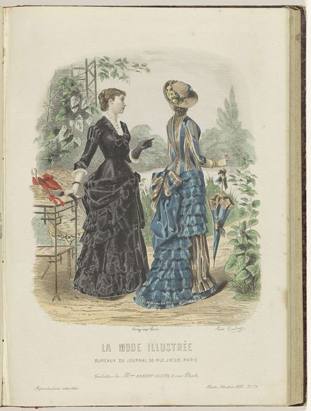 Editor: Here we have "De Bazar, 1887, Nr. 8, Pl. 679", a watercolor print by an anonymous artist. It depicts two women in elaborate dresses; the details are incredible. What stands out to you most about this piece? Curator: I'm immediately drawn to how this image functions within a broader historical and social context. Consider the fashion plate itself. It served not only to illustrate current styles, but also to reinforce the era's restrictive social structures, particularly concerning women’s roles. Editor: Restrictive? I hadn't considered that. Curator: Absolutely. These elaborate dresses, beautiful as they are, were incredibly limiting. They physically confined women, mirroring their limited access to public life and economic independence. Notice how the environment seems almost secondary to the clothing. Editor: Yes, the women almost seem divorced from their surroundings, now that you mention it. Curator: Precisely! It underscores how a woman's primary identity was often tied to her appearance and social presentation, effectively objectifying her. We can also consider the print's implicit audience – upper-middle-class women who had the leisure time and financial means to engage with fashion. It highlights societal divisions, doesn't it? How do you see class playing out here? Editor: I suppose it emphasizes the separation between the elite and those who could never afford such garments, accentuating their restricted access to social mobility. I'd never considered fashion as a statement of social and economic division. Curator: It’s a potent reminder that even seemingly innocuous images are often deeply embedded in complex power dynamics. Editor: I see the image in a completely different light now! It's fascinating to consider how art and fashion can reflect and reinforce societal norms. Thanks for sharing this perspective!