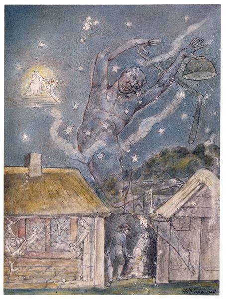 Curator: William Blake created this watercolor, "Lucia Carrying Dante in his Sleep," as an illustration for Dante's "Divine Comedy." Editor: The hazy blues and greens evoke a dreamlike state. There's a definite sense of ethereal guidance here, with Lucia suspended mid-air. Curator: Blake was deeply concerned with spiritual and political liberation. Lucia, a symbol of divine light, is rescuing Dante from the dark wood of error, a theme resonant with Blake’s own radical views. Editor: The figures are elongated, almost weightless. Note how Blake uses line to suggest movement and the flow of Lucia’s garment. Curator: The positioning of Lucia above Dante could be interpreted through a feminist lens, suggesting the power of feminine virtue to uplift and guide humanity. Editor: I find it fascinating how Blake uses watercolor washes to create a sense of depth despite the relatively flat composition. It almost feels like a fresco. Curator: Blake's vision continues to offer new perspectives on how we understand power dynamics and spiritual journeys. Editor: It encourages a real focus on the emotional impact of form.