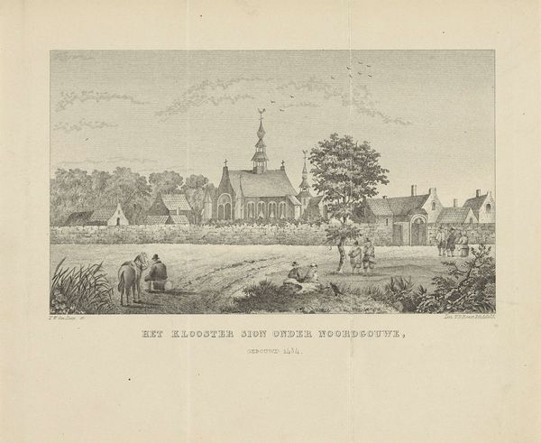 Hermanus Petrus Schouten created this print of Gezicht op Keulhorst using etching techniques sometime between 1747 and 1822. The composition is structured by a gentle rise, upon which a church and some modest buildings stand. The scene is bathed in a uniform, soft light that subdues any stark contrasts. The artist’s hand is evident in the subtle gradations of tone, achieved through delicate cross-hatching and stippling. This creates an atmospheric perspective where forms gently fade into the distance. The human figures, rendered with simple lines, are placed in the foreground as if to invite the viewer into the scene. Schouten’s work reflects the 18th-century interest in portraying the landscape as both an aesthetic object and a symbol of social order. The print's meticulous detail speaks to a broader cultural desire to classify and understand the world through empirical observation. The very act of etching, with its controlled lines and repeatable nature, is an exercise in rationalizing the visual world. This print thus acts as both a representation of a physical place and a statement about humanity's relationship to its environment.