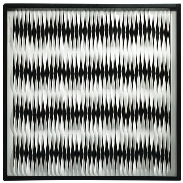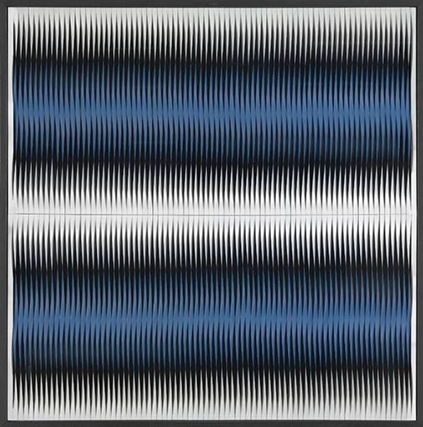 Walter Leblanc created this artwork, Mobile-Static M 0 27, with paint and likely a very careful, labor-intensive process. The visual effect is of two fields of vertical stripes, red and blue, their lower registers converging like stalactites and stalagmites in a cave. This may be a painting, but the precision and orderliness of its composition suggest the mindset of a designer. The interplay of colors creates a sense of movement, despite the static nature of the medium. Leblanc’s application of paint speaks to the amount of manual effort involved, as well as his close engagement with materials. In Leblanc’s hands, the traditionally separate realms of painting and industrial design come together. The final piece bridges fine art and craft, urging us to appreciate the skill in its making, and in turn, expand our view of what art can be.