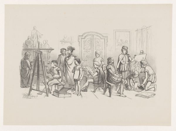 Editor: This print, “Salamon de Caus at Bicêtre,” made sometime between 1640 and 1676, is an etching by Jacques Courtois. There’s such a strange combination of confinement and festivity… like a play being put on in a prison yard. I’m curious, what does this scene evoke for you? Curator: Ah, it stirs in me echoes of societal tensions, that push and pull between those deemed ‘sane’ and ‘insane’, ‘contained’ and ‘free’. You see Salamon de Caus, trapped. Legend casts him as an inventor, perhaps a genius driven mad or simply inconvenient to power. Isn't it fascinating how a few etched lines can suggest such deep fissures? Editor: Yes, it really makes you wonder. All these figures surrounding him; are they visitors? Are they mocking him? Curator: Perhaps both? The blurred line between observation and exploitation, my dear! Think about Bicêtre itself - it was an asylum, yes, but also a spectacle. The 'insane' were viewed almost as a tourist attraction! Is this print a critical commentary, a voyeuristic glimpse, or a lament? Maybe, like madness itself, it refuses easy definition. Editor: That’s a darker reading than I first considered, but it definitely resonates. The way they are observing him behind the bars, it reminds me of people at a zoo. I hadn’t considered the exploitative aspect of it before. Curator: The beauty, and sometimes the horror, of art lies in its mirrors – what it reflects back at us about ourselves and our world. Now, I wonder, what new echoes do you hear within its lines? Editor: I now perceive this as an art of social commentary and I see a dark beauty to this etching and the complexity of madness during that era. Curator: Indeed! And so the dance between art and understanding continues, shifting with each observer, each echo heard.