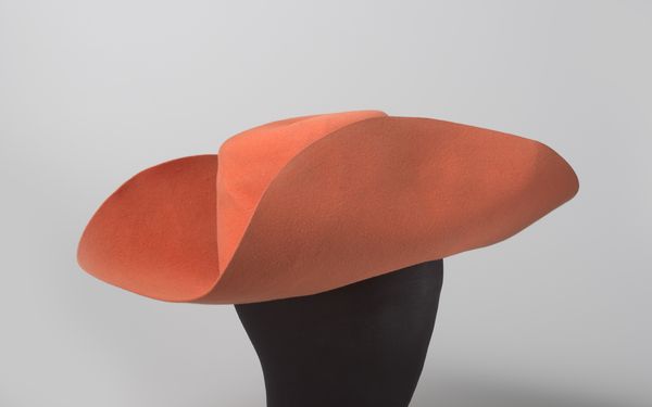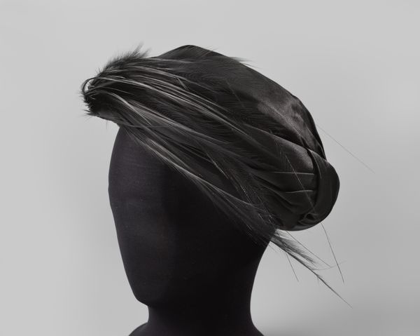 Editor: This is 'Hoed van zwart vilt,' or 'Hat of Black Felt,' created around 1956 by T.C.C.M. Hoogland, using textile. It looks almost severe in its simplicity. There’s something very reserved about it. What do you see in this piece, Professor? Curator: Oh, reserved, absolutely! It whispers, doesn’t it? I think about the ‘50s, post-war austerity blooming into this burgeoning sense of feminine… I hesitate to say power, but maybe presence? This isn’t a showy, look-at-me kind of hat. The subtle curves, the implied volume—it's architectural. Are we sure it's felt, and not another material? Look how stiff the brims seem... Editor: That's interesting – I hadn't considered the architectural element. The information specifies 'textile' so the "felt" description may be imprecise, however the source doesn't elaborate. Given its somber mood, do you think the hat was ever part of a vibrant collection? Curator: Vibrant, you say? Perhaps… maybe that’s what it *covered*. Think of those magazine covers from the time, the technicolor dreams! Maybe this was an antidote, a bit of cool sophistication to temper the era's exuberance. It feels… considered, even controlled. Like a dam holding back a very fashionable flood. What are you taking away from this? Editor: I’m now picturing the hat as a statement, a quiet rebellion, if you will, against all the ostentatious clothing from that era. It makes the wearer stand out by not trying to. It is quite empowering. Thank you for sharing your thoughts! Curator: And thank *you* for offering that fresh perspective! Art, and even hats, are really just conversations waiting to happen, aren’t they?