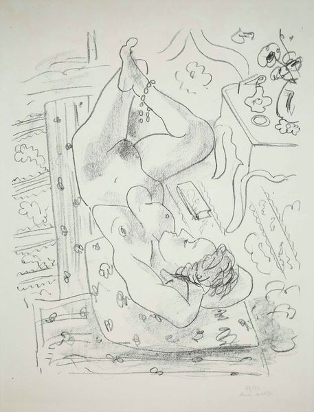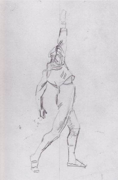Editor: So, this is "Dance on the Drum," an ink drawing done in 1977 by Vasile Kazar. The loose lines create this sense of dynamic energy, but the subject matter itself feels almost…abstracted. What do you see in this piece from a historical context? Curator: Well, seeing as this drawing was produced in 1977, it comes at an interesting point in the history of modernism and abstraction. By that point, we're witnessing both its institutional acceptance and a building critique, largely related to modernism's tendency toward elitism, it’s frequently apolitical stance, and limited access in previously communist states. Does this sketch offer a vision of folk culture that engages or resists those themes? Editor: That's a good question. It's definitely figurative, hinting at movement and sound. But you're right, it is also removed in some way from direct representation. Curator: How do you think Kazar's visual language serves or subverts socialist realist values for example, since figurative themes were favored as subjects? Is he creating a new kind of folk hero, or commenting on something else entirely? Editor: Maybe it’s about preserving tradition while acknowledging that traditions transform over time? The drawing suggests a celebration of music and movement. It invites the viewer to participate imaginatively, which counters the idea of prescribed cultural experiences often found in state-sponsored art. Curator: Exactly. The sketch-like quality might be seen as a gesture toward the everyday, democratizing art-making itself. The deliberate simplification challenges traditional representational values but what message is sent by rendering the performing body as fractured and geometric, almost machine like? What could this reference to industry suggest, beyond the purely celebratory dance? Editor: I see what you mean. It’s like it’s acknowledging the influences of modern life, perhaps questioning whether "pure" folk expression is even possible in a world of industry. This makes me see the piece in a new way. Thanks! Curator: And me too! I am happy that we can observe history reflected even in fleeting sketches!