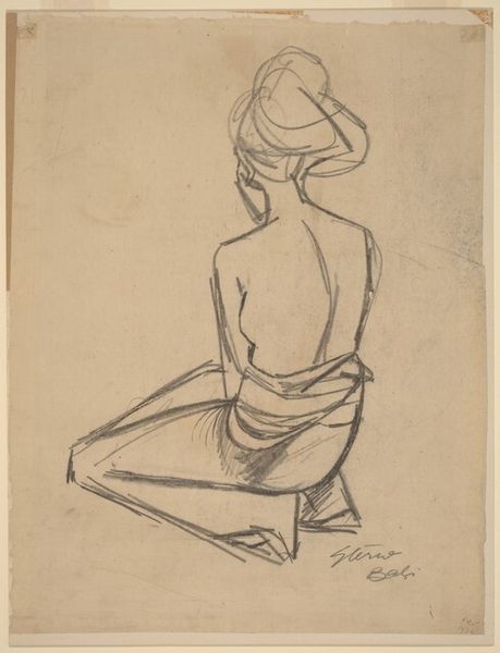 Editor: This is Alfred Stevens' Study for a Seated Woman Gazing at ‘Magog Thrown into the Sea’, for Dorchester House. It's a detailed drawing. I'm struck by how the artist captures the human form with such precise lines and shading. What do you see in this piece? Curator: The formal elements are quite compelling. Note the interplay of line and form, the anatomical accuracy, and the strategic use of shading to create depth and volume. These elements coalesce to produce a sense of classical beauty. Editor: It's interesting that you focus on the classical aspects. I hadn't considered that specifically. Curator: The artist's choices create this effect. The composition, the pose, even the medium—all contribute to its formal qualities. Perhaps this gives us insight into the artist's influences. Editor: Thanks, that helps to clarify my understanding.