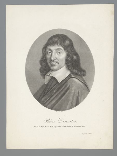 Ambroise Tardieu made this print of René Descartes in the 1800s. Tardieu was a prominent engraver during a period of significant social and political upheaval in France, from the French Revolution to the rise and fall of Napoleon. Here, Descartes is presented through the lens of the 19th century, a time of burgeoning scientific advancement and philosophical inquiry. Tardieu’s choice to depict Descartes, a figure synonymous with rationalism, reflects the ongoing dialogue between Enlightenment ideals and the evolving social landscape. It is interesting to consider how the values of Tardieu’s era shaped his interpretation, adding layers to Descartes' legacy. Portraits often reveal as much about the sitter as they do about the artist and the society in which they operated. In what ways does Descartes, as portrayed here, conform to or challenge the expectations of his time, and how does this image speak to our understanding of identity, intellect, and historical context?