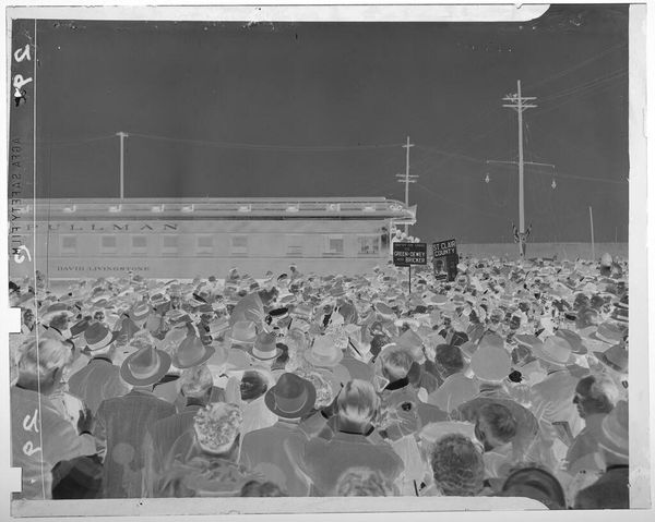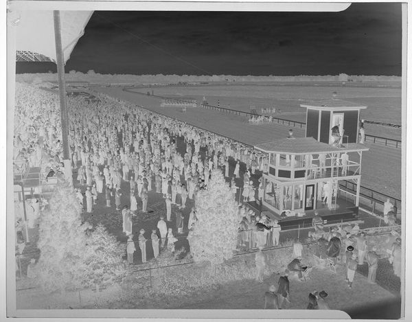 Curator: This photograph, simply titled "Untitled (county fair buggy race)," comes to us from the Hamblin Studio. Editor: I'm immediately struck by how this scene, though capturing a public spectacle, feels intensely private, almost ghostly in its monochrome. Curator: It’s a fascinating snapshot of Americana. County fairs, especially with their buggy races, were key social events. They fostered community bonds and reflected the rural economy. Editor: Absolutely, but there's also an interesting tension. The celebratory scene is tinged with a certain socioeconomic division; who is performing versus who is watching? The tents in the background may imply who is not watching the spectacle. Curator: I think that’s a fair point. The composition directs our gaze to the spectacle, but that's not the whole story. Editor: It makes me consider the broader context of leisure and access, which are so important in understanding the period’s social dynamics. Curator: Indeed. This image offers a glimpse into a world where entertainment and class were intertwined. Editor: It is a stark reminder of the layers embedded within even the seemingly simple moments of communal gathering.