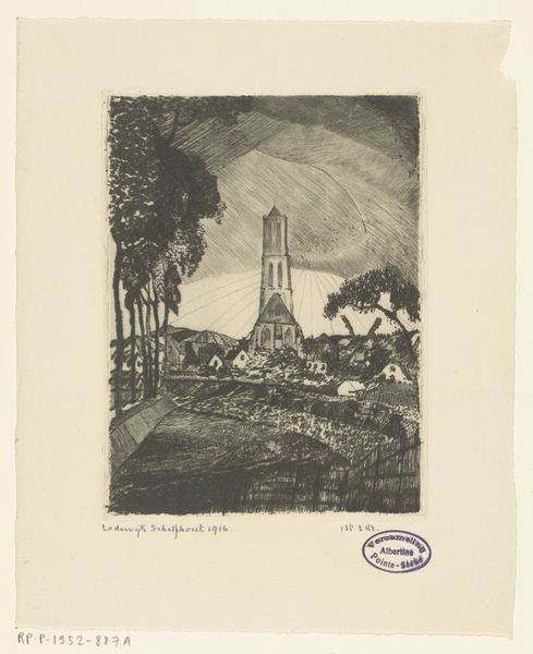 Curator: Looking at this etching, I am instantly drawn in; it has such an incredible brooding feeling. There's almost an urgency to the sky, like a storm is coming. Editor: That urgency, that storm brewing, resonates so much when you situate this 1917 landscape within the historical context. Europe, already ravaged by the First World War...the anxiety, the uncertainty...it’s all palpable. We see here Lodewijk Schelfhout’s “Heuvellandschap met molen," Hill landscape with mill. Curator: And isn't it cleverly done? It's not overtly political. Rather, it feels…elemental. The looming windmill becomes this monolithic guardian, overseeing a scene with an almost haunted atmosphere. The village seems so… fragile, as if this landscape will simply absorb it back. It reminds me of a silent movie somehow. Editor: The landscape genre itself had become laden with symbolic meaning. These were troubled times. You are not just painting a pleasant picture; you are creating statements about territory, about identity, about the fragility of a certain way of life. I think Schelfhout's use of frottage and etching adds to that mood; there is a roughness here, a darkness in the texture itself. It reminds you that landscapes were frequently idealized places that were rapidly changing. Curator: Definitely. The texture provides such an edgy energy. Those scratchy marks amplify that brooding feeling so expertly. It seems expressionist, a style really gaining traction then to communicate such feelings! Even this windy road in the front is inviting but also gives this weird vibe. I feel tempted to get in and go, but at the same time I'd feel hesitant to wander on such road. Don't you agree? Editor: Absolutely. Roads can offer literal freedom but also entrapment. Remember this work comes from a time when modernity's promises felt both liberating and threatening. Schelfhout, by manipulating scale and texture, echoes this sentiment beautifully. The everyday transforms into an embodiment of historical undercurrents. Curator: Well said. This tiny artwork packs an unexpectedly powerful punch once we let its subtle complexity bubble to the surface, doesn’t it? Editor: Indeed. By engaging with the art on an emotional level, then zooming out to examine the historical and social conditions, we truly discover why Schelfhout's print lingers long after you leave it.