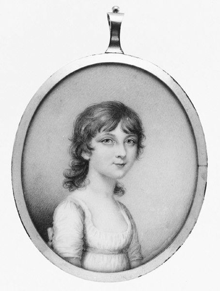 This is Nathaniel Rogers's "Portrait of a Girl," a delicate watercolor on ivory. The composition presents a young girl, rendered with remarkable precision. Rogers masterfully uses soft gradations of light and shadow to model her face, achieving a lifelike quality within the small dimensions of the portrait. The texture of her hair is suggested through fine, controlled brushstrokes. The portrait engages with the semiotics of portraiture, using visual codes to communicate status and character. The girl's simple yet elegant dress and the small bouquet she holds imply innocence and purity. Rogers's work reflects a broader artistic and philosophical interest in capturing the essence of the individual. Notice how the formal elements – the subtle color palette, the smooth surface, and the balanced composition – work together to create an intimate and idealized image. This artwork remains a site of ongoing interpretation.