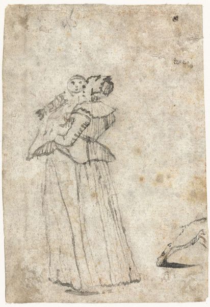 Curator: The sheer tenderness emanating from this piece is striking; it’s so raw and beautifully simple. Editor: Indeed. What we have here is a coloured pencil and pencil drawing on paper titled "Vrouw met kind op de arm" – Woman with child in her arms. It's attributed to Simon Andreas Krausz and estimated to have been created sometime between 1770 and 1825. The image depicts a woman, presumably a mother, holding a child. It appears to be more of a sketch or preparatory drawing, focusing on capturing form and gesture. Curator: It does feel incredibly intimate, doesn’t it? It's like stumbling upon a quiet, private moment. Almost as if the artist were sitting just a few feet away. Editor: The academic style hints at a society where artistic skill was rooted in formal study. Genre paintings like these elevated scenes of everyday life to subjects worthy of artistic attention. They reveal a growing interest in the domestic sphere. It mirrors a rising middle class defining their lives through family. Curator: Funny, because to me the 'academic' aspect you mention melts away under the tenderness of the drawing. Look at the line where the baby’s cheek rests against her mother. Such a fragile caress! Editor: Absolutely. This simplicity may also indicate that it wasn’t a formal commission, and might have remained within the artist's personal collection, which would speak to a more genuine emotional exploration. Its value may have rested primarily in what it meant to him. Curator: Right. It gives a beautiful glimpse of what someone considered worth sketching for themselves and nobody else. It's less performance, more pure affection. Editor: Reflecting on this, I appreciate how the unrefined quality can almost feel like a rebellion against the highly polished portraits often displayed during this time. It is almost like a private act of affection memorialized on paper. Curator: And to come back to where we started, yes, the lasting impact of Krausz’ drawing for me comes back to tenderness. The drawing contains a truthfulness only a quickly captured, vulnerable study like this can offer.