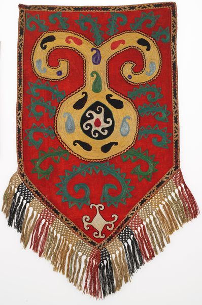 This is an Ilgich made by a Khirgiz artist. Ilgich, meaning “to the front,” is a traditional textile crafted by Khirgiz women to adorn the space above a bed in the yurt, a portable, bent dwelling structure, commonly used by nomads in the steppes of Central Asia. These textiles, often made in vibrant colors and bold patterns, serve as potent symbols of cultural identity, social status, and familial heritage. The communal nature of Ilgich production fosters intergenerational knowledge exchange, embodying the values and experiences of women within Khirgiz society. Though abstracted, floral motifs are often interpreted as symbols of renewal and abundance, reflecting a reverence for nature and the spiritual interconnectedness of all life. Consider the Ilgich as a vibrant assertion of cultural identity, reflecting the resilience, artistry, and historical consciousness of the Khirgiz people.
