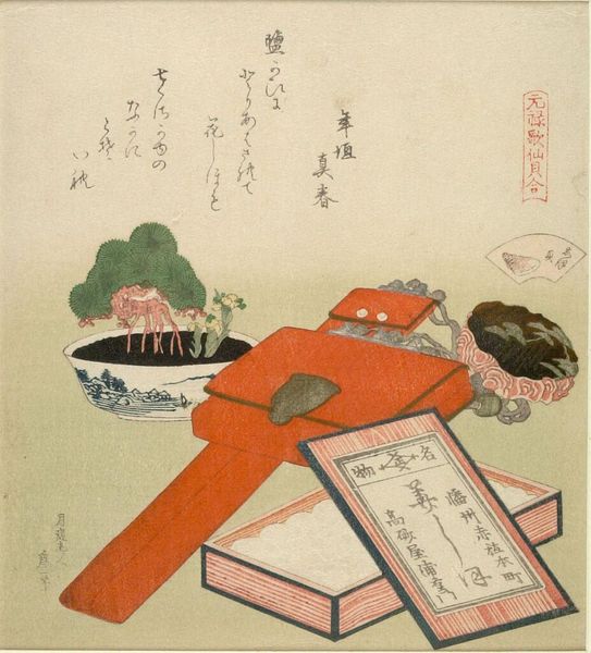 Curator: Hokkei's "Refreshments for a Theatre Outing," created around 1823, welcomes us with a comforting slice of Edo-period life rendered in a Japanese woodblock print. What jumps out at you? Editor: An almost dreamlike serenity. The everyday elevated—those simple oranges, the muted colours. It feels like a very intimate, private scene...almost sacred in its quietness. Curator: That serenity resonates so strongly. And you're right; even a mundane moment is worthy of our artistic attention. Look closer. We're offered glimpses into popular culture, what theatergoers of the time may have purchased. There’s even some evocative text along the left side. Editor: Ah yes! I'm interested in the fan, with its geometric divisions. Such carefully rendered objects point beyond mere representation. Think of fans in Asian cultures. The folded fan could signify status and sophistication—a world of unspoken meaning. And consider the citrus; symbols of good fortune? Curator: Quite possibly! They almost glow, don’t they? And that’s precisely where Hokkei's artistry shines through. The citrus could be referencing a Chinese medicine for respiratory health as well to ensure strong performance for theater actors and entertainers. What kind of theater could they attend, I wonder? Kabuki? or even a local Bunraku puppetry. Editor: I’m now contemplating the colour choices, the subtle washes that create a peaceful yet vivid scene. Did people find woodblock prints to be immersive escapes? It’s as if Hokkei wished to offer not just representation but an actual mood, to channel emotions into physical symbols for audiences of their time. Curator: Beautifully said. His choice of medium speaks to this democratization of art and narrative during the Edo period. The ukiyo-e tradition itself embraced these "floating world" moments, and Hokkei offers a very grounded sense of enjoyment. A theater outing became something lasting and relatable. Editor: So, we stand before a print that serves both as historical document and as an exercise in visual symbolism. Remarkable. Curator: Exactly. Art, memory, feeling. In these fleeting glimpses into history, we catch sight of ourselves too.