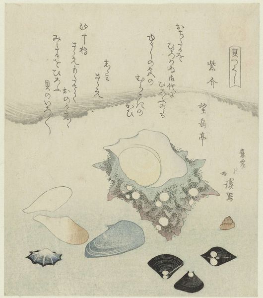 Ishikawa Kazan created this print, Designs of Fans for Dance, using woodblock printing techniques in the early 19th century. The arrangement immediately strikes us: three fan shapes dominate the lower half of the composition against a muted, pale ground. Above them, vertical columns of Japanese script add a textual layer to the visual imagery. The fans themselves are treated in varying styles—one a cool blue with organic motifs, another with bold, symmetrical spots, and the third with an almost marbled effect achieved through fluid lines. Note how Kazan uses color and pattern to differentiate each fan, giving each one a distinct presence. The overlapping arrangement creates depth, drawing the eye through the composition. By juxtaposing the geometric shapes of the fans with the flowing lines of the calligraphy, Kazan creates a balance between structure and fluidity. This formal dialogue challenges our understanding of traditional printmaking by embedding movement and dynamism within a static form. The artwork invites us to consider how visual elements can intersect with cultural codes to produce innovative meanings.