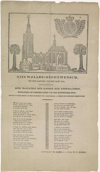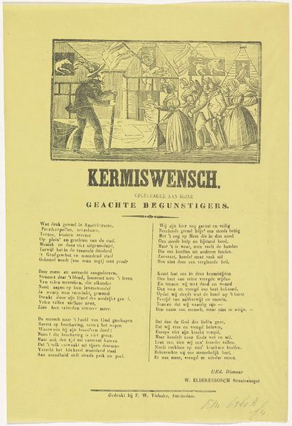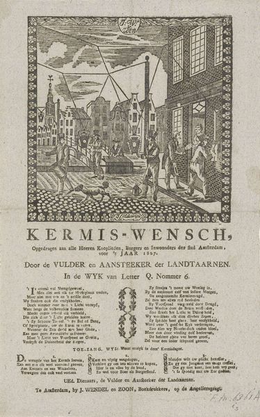 Curator: This is "Kermisprent van de Amsterdamse Straatveegsters," a festive print from around 1855-1860. It resides at the Rijksmuseum, attributed to an anonymous artist. Editor: My first impression? A burst of intricate detail! The balance between the architecture and the lively street sweepers really captivates me, it's incredibly immersive. I’m pulled right into this historical Dutch scene. Curator: It’s fascinating to consider this print as a cultural snapshot. The street sweepers weren’t just maintaining order; in the imagery of the era, they represented civic pride. Their work would have held huge significance, ensuring order amidst the chaos of a city gathering. Editor: Absolutely! They were essentially ensuring that 'the show could go on!' The contrast is really vivid for me. The text gives them voice and humanity, but look at how small they’re depicted, laboring at the edges of a celebration. Were they truly appreciated, or were they a background component of city life? Curator: A crucial question, especially when viewing this through a symbolic lens. Street sweepers are symbols of purification and cleanliness. But it raises further queries: is it superficial, to keep the surface clean during a festival that likely generates as much waste as joy? Or is it part of a greater aspiration for societal progress, visually reflected in cleanliness? Editor: You're pulling back so many fascinating layers, which just goes to prove how evocative even a modest piece like this can be. The delicate framework, with the buildings clustered within, resembles a stage for their performance of work. I now feel like the print beckons us to look past the immediate, into the values the scene promotes. Curator: Precisely, it highlights an ongoing discourse between celebration and obligation, between those who participate in the festivity and those whose labor enables it. Editor: This has really nudged me towards considering art's ability to highlight not just the spectacle, but also the more delicate intricacies that exist quietly in society.
