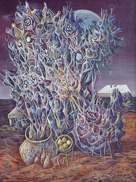 Curator: Ernst Fuchs's acrylic painting, ADAM MYSTICUS, created in 1982, certainly has an immediate impact, doesn’t it? The entire composition seems to vibrate with symbolic tension. Editor: It feels…crowded. Like a surreal stage where too many dramas are unfolding at once. But the serpent coiled around the central figure is immediately arresting, and the ethereal figure above feels almost…liberating, or offering some kind of salvation. Curator: The “crowded” feeling is integral to Fuchs’s oeuvre, I believe. It's a calculated density that pulls in multiple layers of symbolic weight, stemming from his engagement with the Vienna School of Fantastic Realism, seeking to rekindle surrealism and inject spiritual elements. You can see influences from diverse traditions—alchemy, mythology, Christianity, Jewish mysticism—all converging here. Editor: Absolutely. That serpent isn’t just any serpent; it echoes the Edenic tempter, coiling around what appears to be Adam. Yet the way he's interwoven with the tree also makes me think of the Kabbalistic Tree of Life, representing spiritual ascent. And then there’s the nude figure, a female figure holding up a fruit - is this Eve, or some higher, Gnostic principle offering forbidden knowledge? Curator: Fuchs himself intended this image to serve as the unveiling of hidden realities, revealing mankind’s essential interconnectedness within an esoteric vision. We have the animals to either side – a fox, traditionally representing slyness or trickery, and a rabbit that often serves as a symbol of fertility, or even the start of a journey as we see a script-covered marker on the side near it. All the symbols are placed perfectly in relationship to one another. Editor: Given the prevalence of religious themes and their subversive interpretation in art at that time, would you say the piece attempts to undermine religious dogmatism by merging numerous different cultural narratives into something more humanist or even anarchic? Curator: Certainly, he lived through a period deeply affected by secularization and re-examination of orthodox faith and beliefs. By pulling these seemingly contradictory myths together in his distinctive art style, with that smooth finish, the vivid colors and stark rendering, Fuchs does force the audience to rethink rigid interpretations and perhaps, arrive at something more nuanced. Editor: Looking at the details has helped unpack its many layers. I originally saw just a cacophony of forms and images. Curator: And now, perhaps, you can see how it fits into a long and complex artistic legacy that uses symbolism to create a space for dialogue and personal revelation.