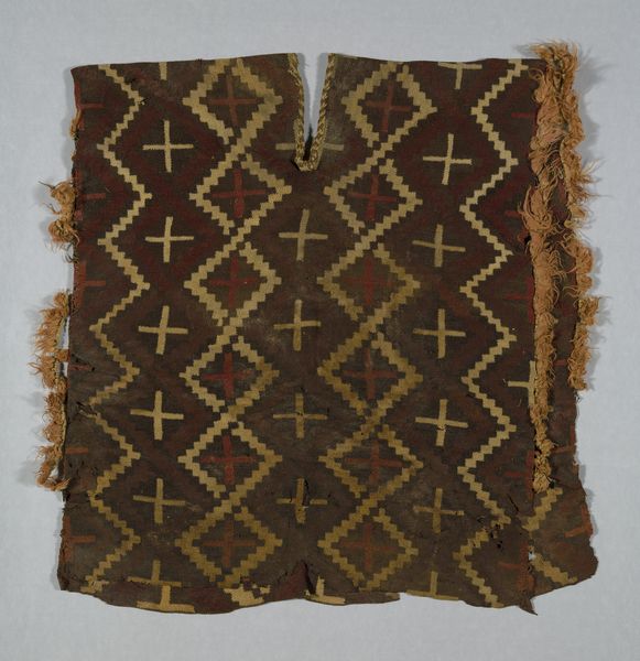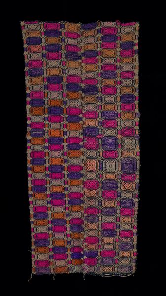 Curator: Immediately, I notice the beautiful rhythmic patterns. This Sarong, from around the 20th century, employs such fascinating geometric designs in its woven cotton textile. Editor: It strikes me as more than just decorative, there's something incredibly intentional in its composition. What can you tell me about how an object like this connects with social practices and cultural history? Curator: Sarongs like these have served important functions throughout communities. The symbolism we often see woven within reflects belief systems or communicates identity and status within different cultures. Think about the motifs that you see being passed down through generations, anchoring individuals in time and kinship. Editor: Right, so beyond simply being aesthetically pleasing, the patterns, perhaps even the colors chosen for the weaving could speak volumes about ritualistic significance or public displays of affiliation. What can you say about how textiles themselves historically play a role as social objects? Curator: Textiles function as more than material items; they act as carriers of cultural memory. We see how they reinforce a collective past by weaving shared experiences, values, and narratives into them. In this particular Sarong, the visual repetitions suggest an interconnectedness, maybe implying continuous communal bonds and stories interwoven across lifetimes. Editor: It's amazing to imagine its possible roles in shaping gender norms and marking significant life transitions throughout these societies too, through ritualized presentation and symbolic colors, isn't it? And the creation of the sarong, using weaving techniques could itself reflect community roles with cultural traditions? Curator: Exactly. The making of a sarong would embody an important form of creative expression and perhaps become integral to identity building in certain areas, representing localized aesthetics and even community distinctiveness. It becomes both art and artifact. Editor: Understanding the Sarong through this cultural context really shifts my understanding; from simply observing geometric patterns I see intricate symbols revealing profound cultural depths. Curator: Yes! These visual codes become powerful carriers of cultural identity, history and psychological depth, adding more meaning. Editor: It definitely provokes fresh insights on textile creation within social narratives as part of cultural identity expression for me!