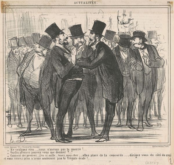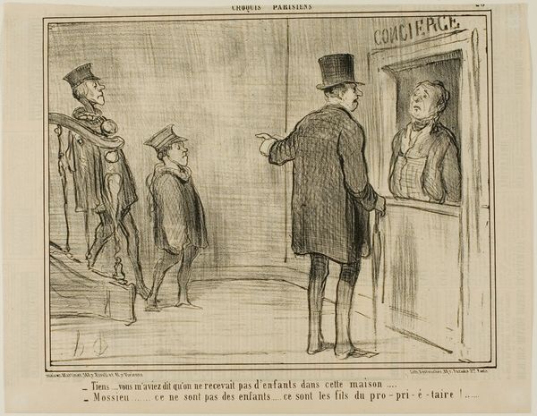 Curator: Here we have Honoré Daumier's lithograph, "Tiens… qu'est-ce qu’c’est donc qu’ça? …," from the mid-19th century. It translates to "Look...what on earth is that?” Editor: Well, "what on earth" is the perfect description! My first impression is almost disgust... Daumier has captured this bourgeois discomfort so brilliantly with the expressive hatching that constitutes the figures. You can practically smell their apprehension, mixed, of course, with their utter incomprehension. Curator: Indeed. It's classic Daumier, isn't it? He's poking fun at the Parisian bourgeoisie. Observe the stark lines used to create caricatures of these well-to-do figures juxtaposed against the unfinished form of the sculpture and then observe the clothing of these people and you have an understanding of Parisian high society at this time. This piece becomes especially poignant considering it was printed during the July Monarchy when class tension was a theme constantly present in French popular and academic culture. Editor: Speaking of production, notice how Daumier leverages lithography here. The grainy quality allows for that rapid dissemination—almost like a proto-meme. The masses can own, literally and figuratively, the critique. And let’s consider the materials involved. Chalk, stone, ink, paper... These are not the tools of rarefied “high art,” but implements readily available, cheap even. Mass media is key here: critique for consumption. Curator: But let's also remember Daumier was trained in the Beaux-Arts tradition! The Romantic flourishes of line and shadow speak to a higher purpose, one aimed at affecting emotional response. His critical perspective is born of personal observation of character and spirit, one feels. It’s almost like Daumier is laughing along with them, while simultaneously judging. Editor: Yes, but there’s a market at play isn’t it? It is worth reflecting on the means of dissemination. What sort of market-driven constraints or imperatives are embedded in Daumier's satirical process? Curator: It's a rich blend, wouldn't you say? To look with clear eyes is what any artist, really anyone who wishes to feel anything at all, should strive for. It may not always be beautiful but it might get you closer to yourself, to our collective consciousness, if there is such a thing. Editor: Exactly. So, let’s think critically about art's entanglement within social life... the material conditions by which Daumier can offer these social portraits, these glimpses into 19th-century France... there's a complex web that Daumier opens up for us to begin to look at art beyond purely formal terms.