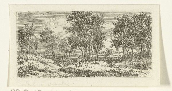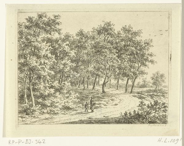 Editor: Here we have Ernst Willem Jan Bagelaar's "Landscape with Woman and Boy on a Road," an etching, dating from sometime between 1798 and 1837. It's a beautifully rendered landscape, but something about the figures on the road seems almost secondary. What do you see in this piece, beyond the immediate landscape? Curator: Well, that relationship between the figures and the landscape is central, isn't it? The late 18th and early 19th centuries saw burgeoning interest in the “picturesque” and the sublime, concepts heavily shaped by socio-political changes. Bagelaar’s etching presents a carefully constructed scene, seemingly capturing rural life. But consider: who is consuming these images? What kind of viewer appreciates such a scene, and why? Editor: That's interesting. So, it’s less about representing reality and more about catering to a specific audience's ideals? Curator: Precisely. Think about the rising middle class, newly able to afford art. There was a hunger for depictions of rural life, often idealized, that helped solidify their own sense of status and taste. The "genre painting" aspect signals that these scenes weren’t just about the land but about social narratives playing out *on* the land. How do you interpret the artist's choice to almost obscure the figures with detailed natural features? Editor: Perhaps the detailed etching emphasizes that idealized romanticized landscape. The figures seem small and less important against nature. It's almost a constructed view of rustic life, isn’t it? Curator: Exactly! It makes me consider what social commentaries this art subtly communicates about emerging bourgeois identities of the time. Editor: I never considered the artwork like that. Seeing it as reflecting cultural positioning has shifted my view of its purpose entirely. Thanks for the historical context! Curator: And thank you, it’s a fresh way to view familiar artwork!