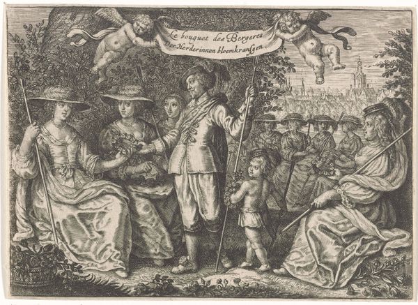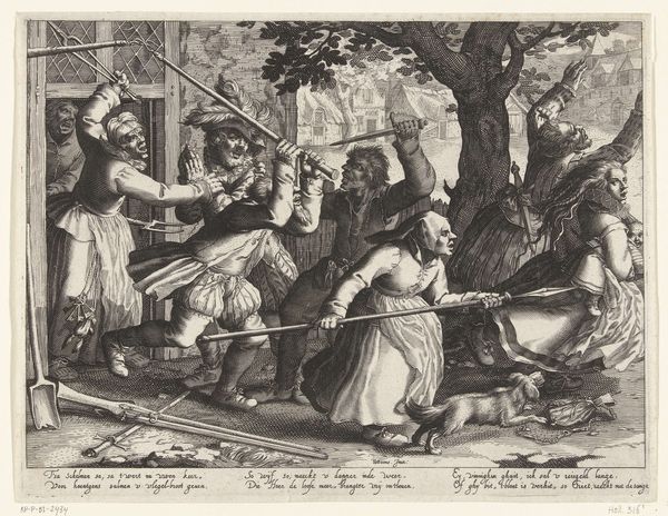 Curator: Looking at this drawing, it's like stepping into a play. I’m captivated by its raw emotion, almost a primal connection. What draws your eye first? Editor: Well, my first impression is how wonderfully tangible this whole scene is. You can almost feel the texture of the paper and see the ink clinging to it. Speaking of which, this is an engraving called "Prediking van Johannes de Doper," or "Preaching of John the Baptist" by Jacques de Bie, dating to the early 17th century. It’s really impressive given that engravings involve working directly onto a metal plate and printing from that. Curator: Yes, isn't it interesting that De Bie, through the rigid material of the engraving manages to make time disappear for a moment. The characters gathered there, with their varying emotions, each reacting in their unique way to John's sermon... What a complex, interwoven fabric. The crowd almost comes to life. Editor: It’s all about layering, both literally and figuratively. Think about how the engraver built up those dark areas – thousands upon thousands of tiny lines etched into the metal! It also makes me consider how these materials shape religious ideas – that mass-produced prints such as these had the ability to distribute the teachings of Christianity much faster and further, almost like propaganda. The dissemination and the message – fascinating! Curator: Precisely! See the city beyond the trees, how it emerges through the landscape. Everything exists in conversation: material and ethereal, finite and infinite, dark and light, truth and illusion. De Bie is really good at inviting us to dive deeper into the human condition, and consider life's complexities, it speaks to my core, really! Editor: And look closely—the choice of paper matters! Its fiber, its weight, how it holds the ink. This particular print appears to have survived the years quite nicely. The value we place on this kind of object speaks volumes about art, craft, and belief through time. Curator: Definitely a piece I'll keep coming back to. The image will continue revealing secrets. The power of visual storytelling will transcend! Editor: For me, understanding its physical making enriches its message, making it relevant for contemporary concerns of labor, value, and distribution. It’s never just an image, is it?