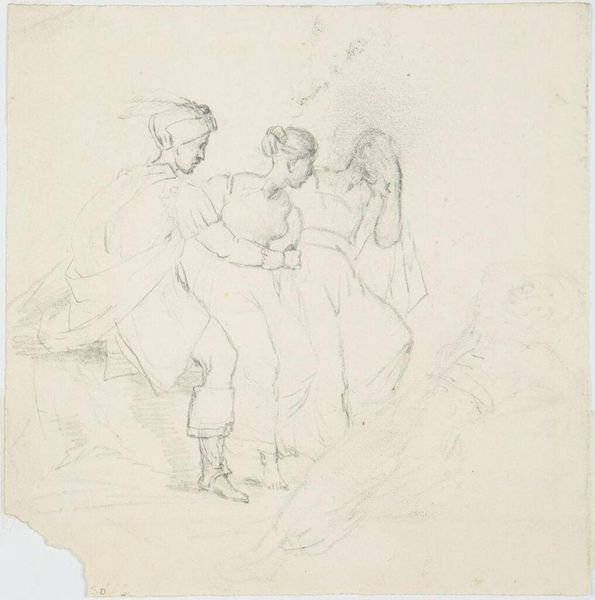 Curator: Look at this arresting drawing attributed to Bartolomeo Pinelli, active between 1801 and 1835. It’s titled “Brigand Chief Held Back By a Woman,” and what you see here on this paper, is executed in pencil and graphite. Editor: It’s loose, full of movement! Almost ephemeral with its light touches of graphite. You get a real sense of dynamic tension, especially between the two central figures. Curator: Indeed. The context is vital here. Pinelli made a career depicting Roman history and the lives of bandits, popular heroes of the time who defied papal authority. The romantic era had a fascination with outlaws. Editor: Fascinating. But if you just consider the pure form, see how Pinelli uses these energetic, almost scribbled lines to define form and space. The contrast gives immediacy, a glimpse into the artist's process of thinking. Curator: And the brigand is almost a Byronic hero type—dangerous, attractive, existing outside conventional society, possibly held back by a lover. These images fueled fantasies about resistance to oppressive regimes. It made him very popular among nationalist audiences! Editor: Right, right. All I'm saying is that it still reads without any social or political knowledge about Roman history or the papal states. You can still feel the push and pull of the forms. Consider the woman’s positioning – she’s actively preventing him from… what? Strife? Some heroic, but probably disastrous deed? Curator: Precisely, the drawing's emotional charge lies in the potential of the narrative. Was Pinelli sympathetic to the Brigand cause or making a critique of male power and ambition? It’s this very tension that reflects Romanticism. Editor: So while the cultural framework tells a fascinating story of rebellion and societal commentary, the directness of the pencil strokes gives access to something elemental: raw emotion. Curator: It does beautifully represent both aspects of life: our individual emotionality mixed up in cultural power dynamics. Editor: True—a single sketch contains multiple levels.