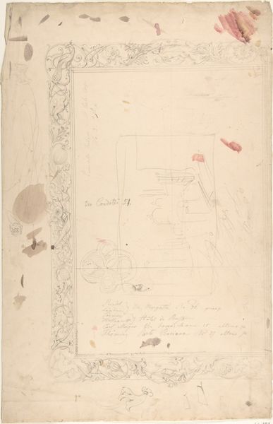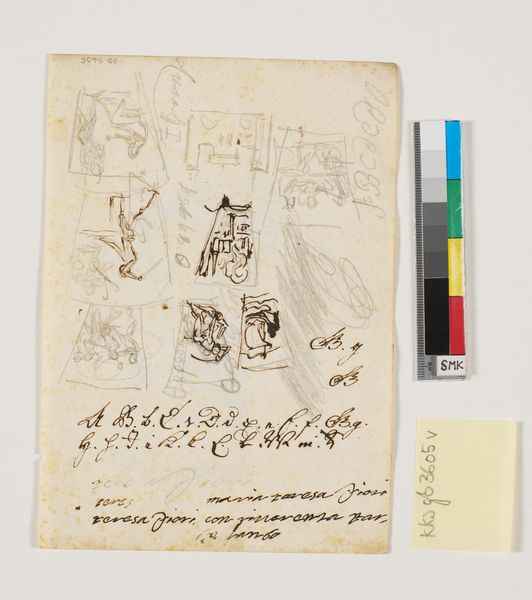 Editor: This sheet of studies by Nicolai Abildgaard, dating from sometime between 1743 and 1809, presents a rather quirky collection of motifs rendered in watercolor: faces, a plant, a chicken in a circle. I find myself curious about this eclectic mix. What do you see in this piece? Curator: What I see is a powerful exercise in association and recontextualization, almost like a personal symbolic dictionary. Take the circle for example; it appears twice. One iteration frames a hen – a symbol of domesticity perhaps ironically enshrined. The other, larger circle remains empty save for what appear to be spectacles: vessels for sight, containers for observation themselves echoing the larger containing circle. Abildgaard gives us the vessel, and we as viewers must determine what goes inside, if anything at all. Editor: That’s a very interesting way to put it – the chicken, those empty lenses. Why the hen specifically, and why put it in a circle? Curator: Well, think about the classical associations with animals; their characteristics projected onto human society: The cunning of the fox, the majesty of the lion. Now, consider that the hen is usually symbolic of the everyday: domesticity, sustenance, the mundane cycle of life and death. Framing this within a circle suggests it isn't just *a* hen, but *the* hen, a distilled essence of “hen-ness.” It becomes more than just poultry; it’s an icon, a potent emblem imbued with cultural weight. And of course the spectacles -- whose vision are we looking through, what biases do they introduce to the 'truth' we think we see? Editor: So it’s a way of elevating the ordinary into something symbolic? Curator: Precisely. Abildgaard is reminding us that the mundane is just as potent a vehicle for meaning as grand historical allegory. It's about decoding what a society, even a single person, deems important enough to elevate through visual language. He prompts us to think about where these symbolic resonances originate and how they continue to shape our perceptions. Editor: I never thought about a chicken in such a complex way before. It is truly fascinating how simple forms can be charged with such symbolic energy!