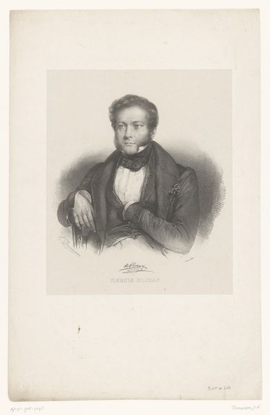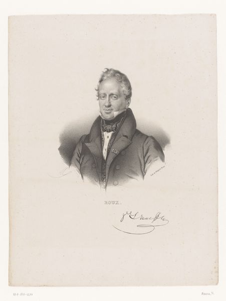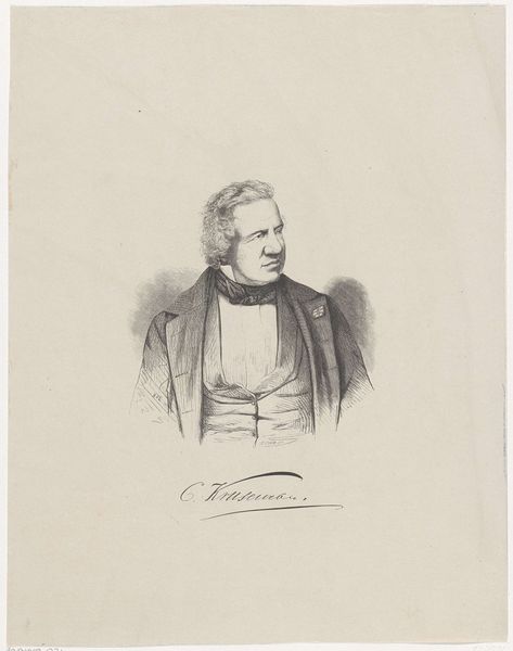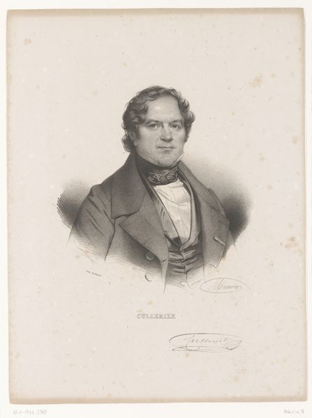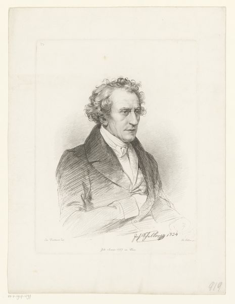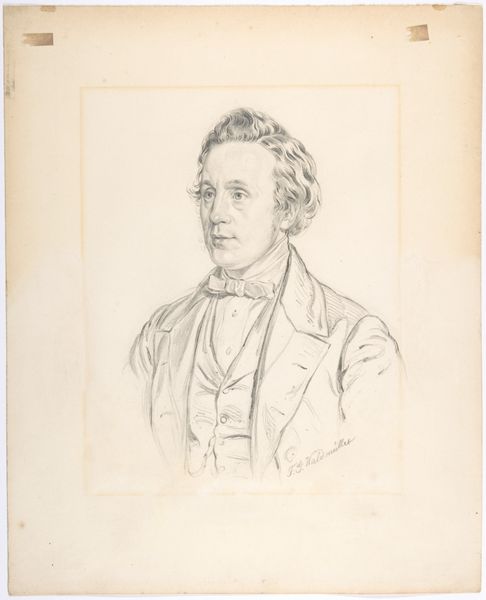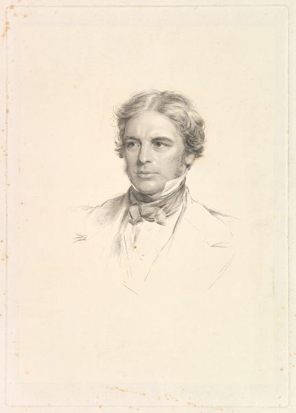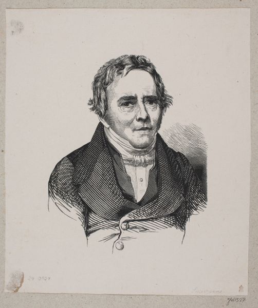 Curator: Here we have a lithograph from 1839. Emil Ditlev Bærentzen rendered this compelling portrait of Hermann Bech. Editor: Ah, a man radiating composure and a certain solemnity. The Romantic period portraits always seemed to catch something of the inner person through meticulous realism. Curator: Exactly. Note how Bærentzen employs line work here. Each line, especially around the eyes and mouth, hints at the emotional or intellectual character beneath the surface. The Romantic artist wasn’t just depicting likeness; they were attempting to capture the essence of the individual. Editor: There’s a vulnerability there, almost masked by the posture. He looks simultaneously present and profoundly elsewhere, in some deep thought. Is it a reflection of his place in the era's grand historical and political narratives, or merely personal musing? Curator: It could certainly be both. Portraits from this period functioned as declarations of status, intellectual standing, but were equally about constructing personal narratives, shaping collective memory through iconic representation. Observe the detailing on his vest. Every button seems deliberate. Editor: Absolutely. And what I love most is how the relatively contained tones somehow amplify the drama. He looks to me a little melancholy, but not oppressively so. There’s a warmth in the gaze. He feels familiar, doesn't he? Someone you might pass in the library, perpetually lost in thought. Curator: Yes, that tension between the public persona and the private self is wonderfully rendered. Bærentzen’s piece prompts us to look deeper. It reminds us how we visually negotiate personality, legacy, and emotion through portraiture. Editor: It’s remarkable to see so much life breathed into a lithograph of this age. A window into both history and human nature itself. Curator: Indeed. It’s a potent reminder of art's power to connect us with echoes of the past and subtle stirrings of the heart.