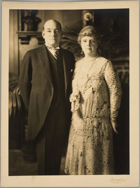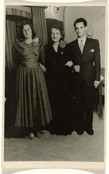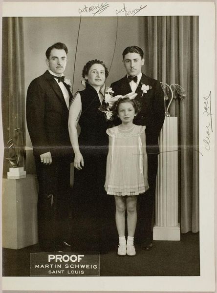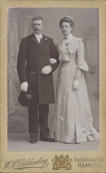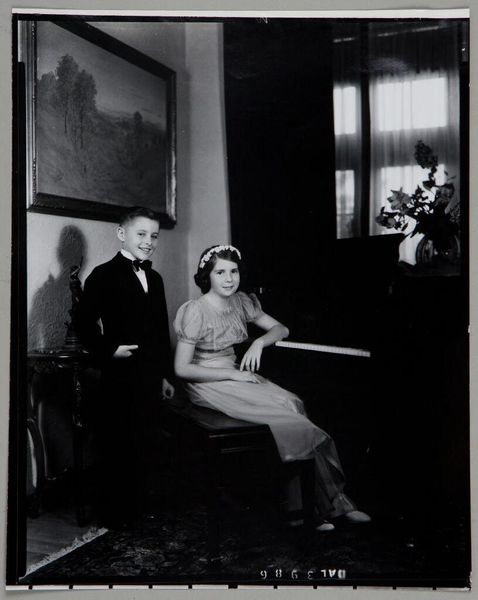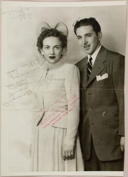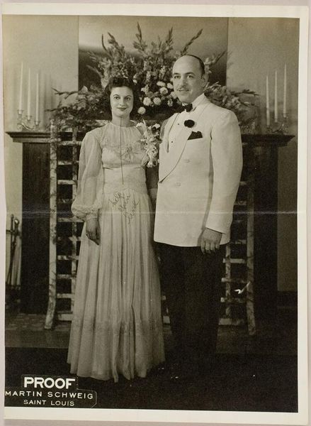 Editor: Here we have an untitled photograph by Martin Schweig, showing a couple in day clothes posing in front of foliage and candelabra. The sharp focus and the way they are framed creates a rather balanced composition. What do you see in this piece? Curator: The geometry is indeed compelling. Note how the vertical lines of the candelabra are echoed in the couple's upright posture, creating a sense of formal rigidity. The tonal range, from the deep blacks of the foliage to the bright whites of the woman’s purse, is quite stark. What might that signify? Editor: Perhaps a tension between the artificial and the natural? Curator: Precisely! The photographer creates visual interest through the interplay of these elements. Editor: I see it now; it's all in the composition. Thanks! Curator: My pleasure. Analyzing structure often reveals deeper meanings.